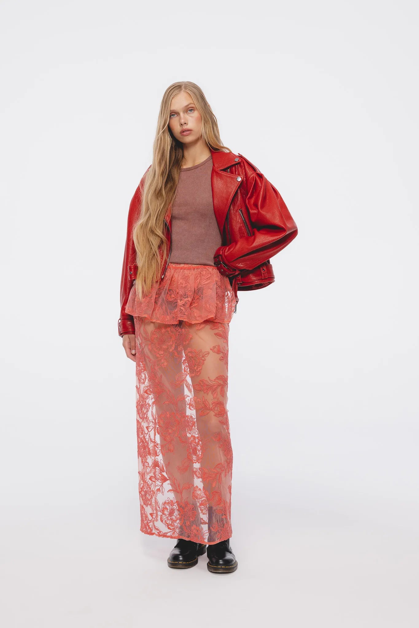 Baskinka Lota w odcieniu koralowym to efektowny dodatek, który wprowadza do stylizacji romantyczny i kobiecy akcent. Uszyta z lekkiej, koronkowej tkaniny, pięknie układa się na sylwetce i nadaje całości subtelnej objętości. Wiązana na troczki w talii, pozwala na idealne dopasowanie do figury oraz podkreślenie proporcji.