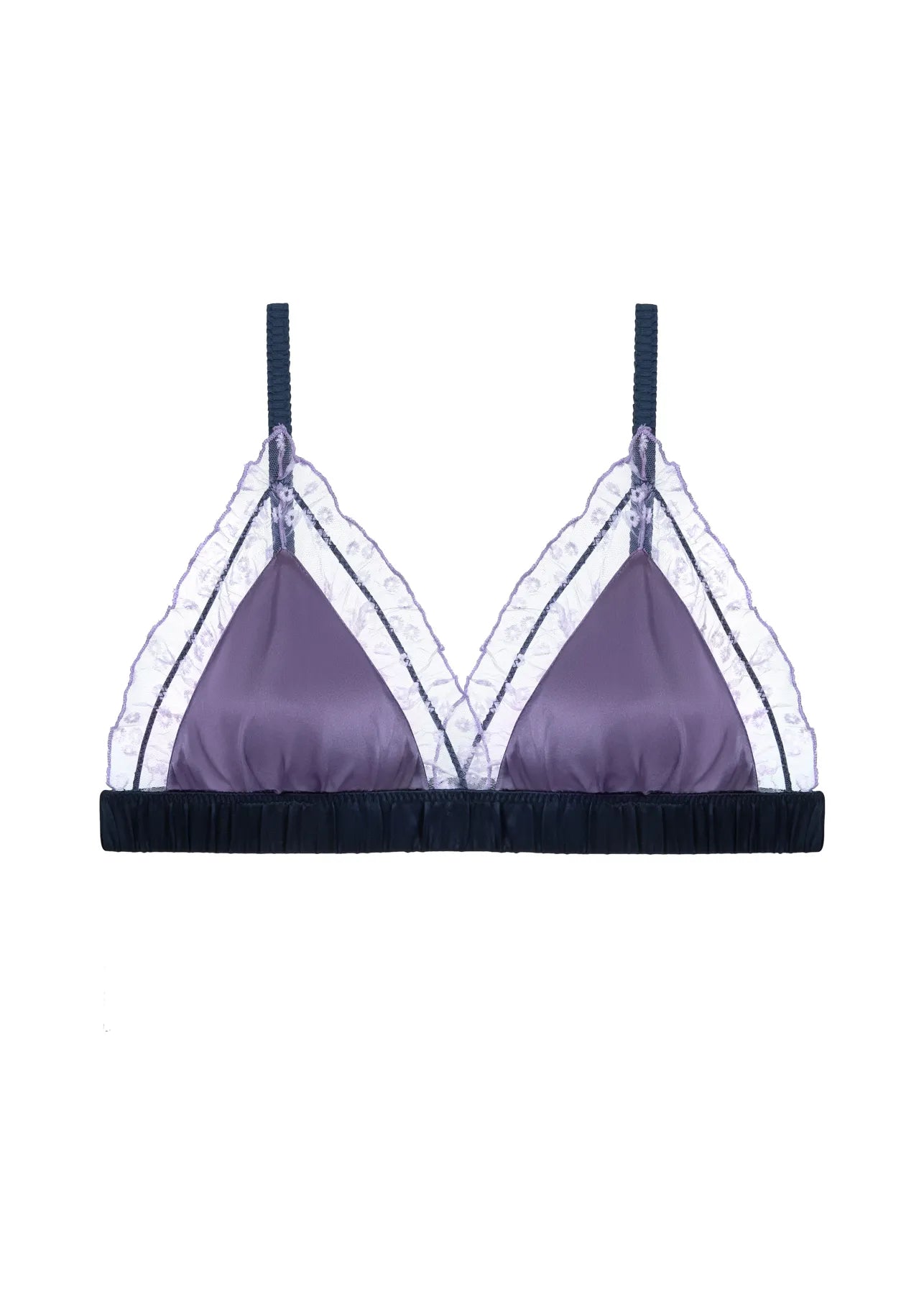 Wykonany z jedwabiu i transparentnej koronki, tworzy zmysłową kompozycję faktur. Miękkie trójkątne miseczki subtelnie dopasowują się do kształtu ciała, a koronka otula je niczym mgiełka, dodając całości świeżości i kobiecego wdzięku.