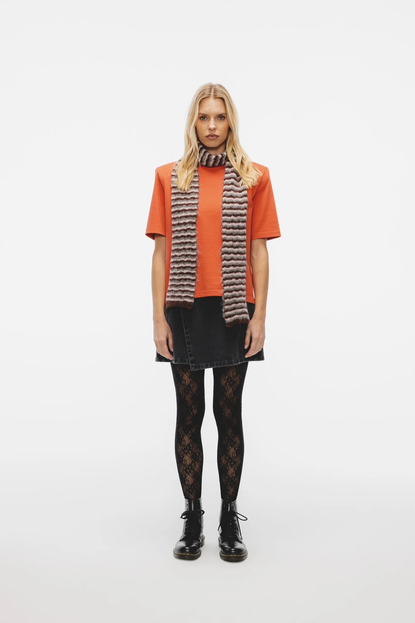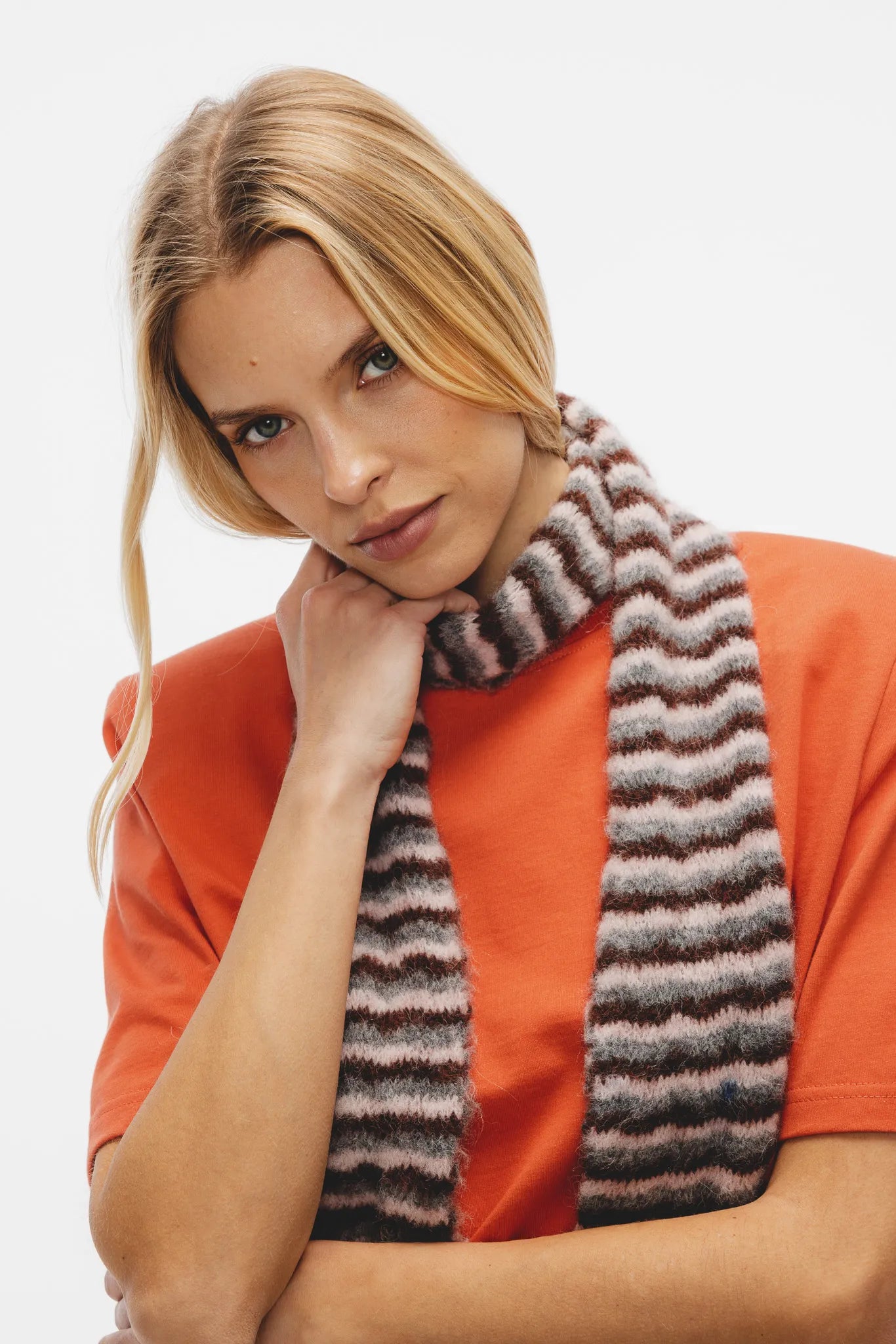 Model wyróżnia się pięknym paskowym splotem w odcieniach brązu, szarości i pudrowego różu, które układają się w delikatny, harmonijny rytm. Dzięki swojej długości 180 cm i szerokości 11 cm, szalik można swobodnie owinąć wokół szyi, tworząc ciepłą, miękką otulającą warstwę idealną na chłodniejsze dni.