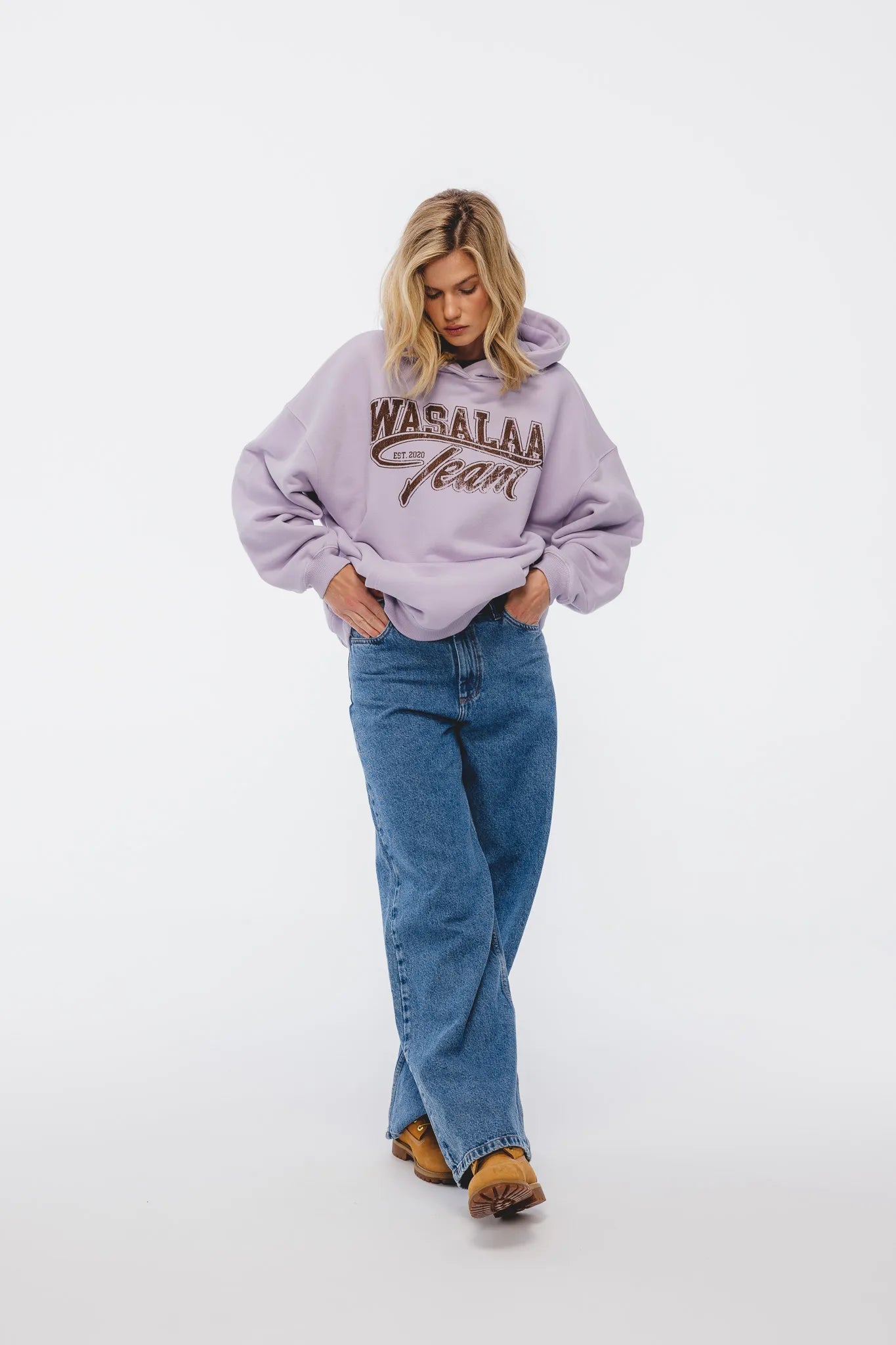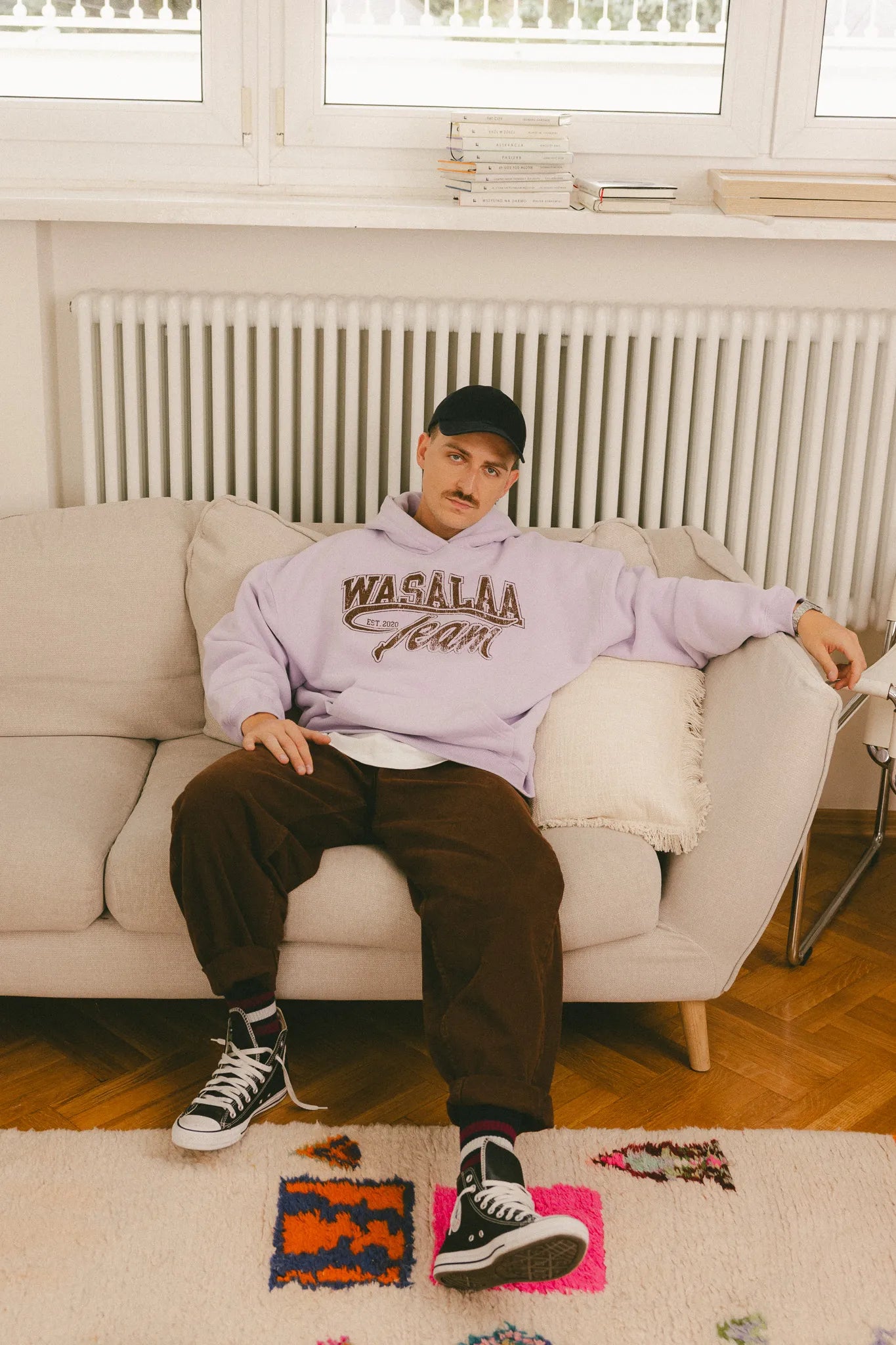 Autorski print Wasalaa Team w czekoladowym odcieniu doskonale kontrastuje z subtelnym, lawendowym kolorem tkaniny, tworząc świeże i wyjątkowe połączenie.