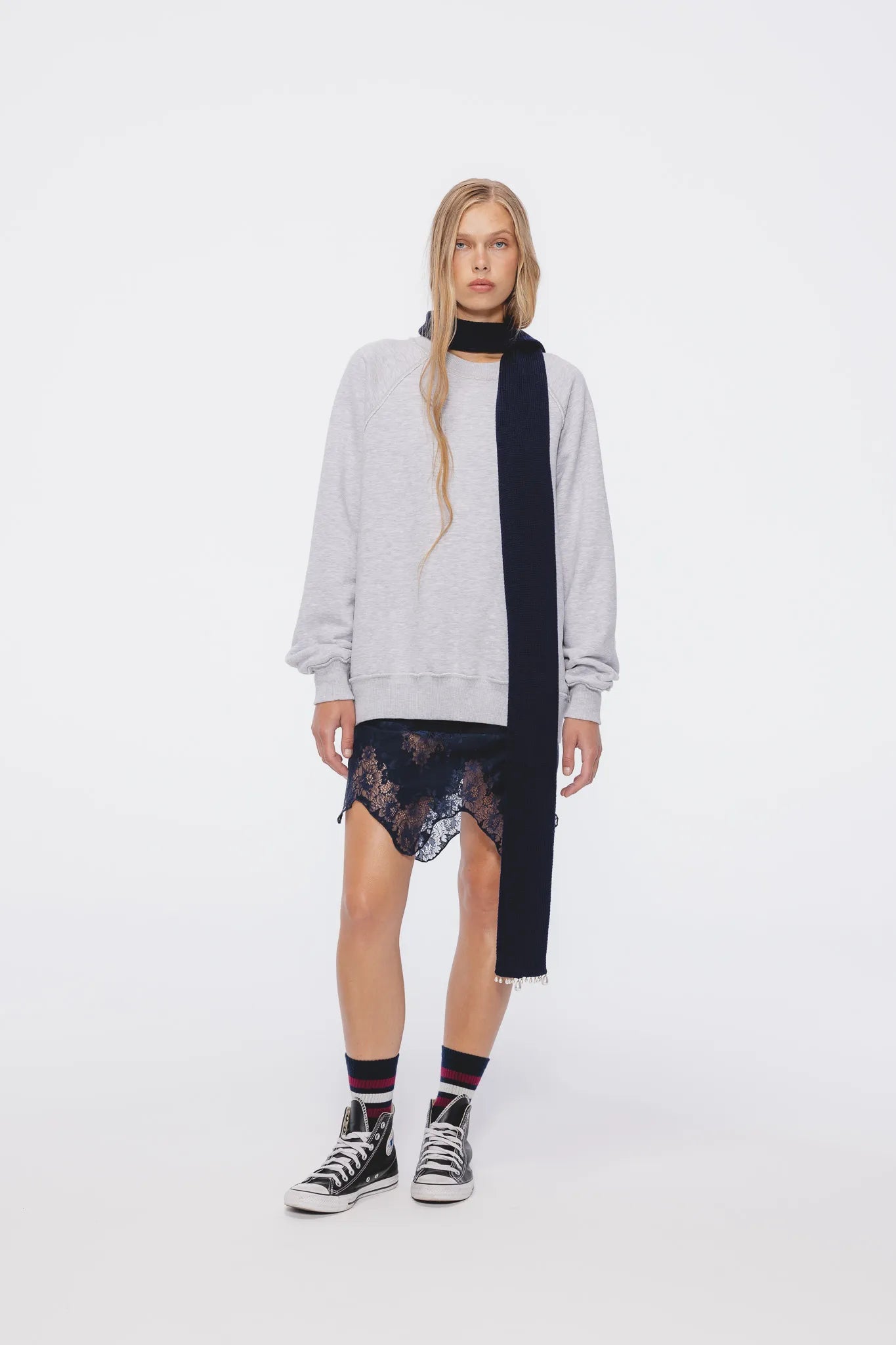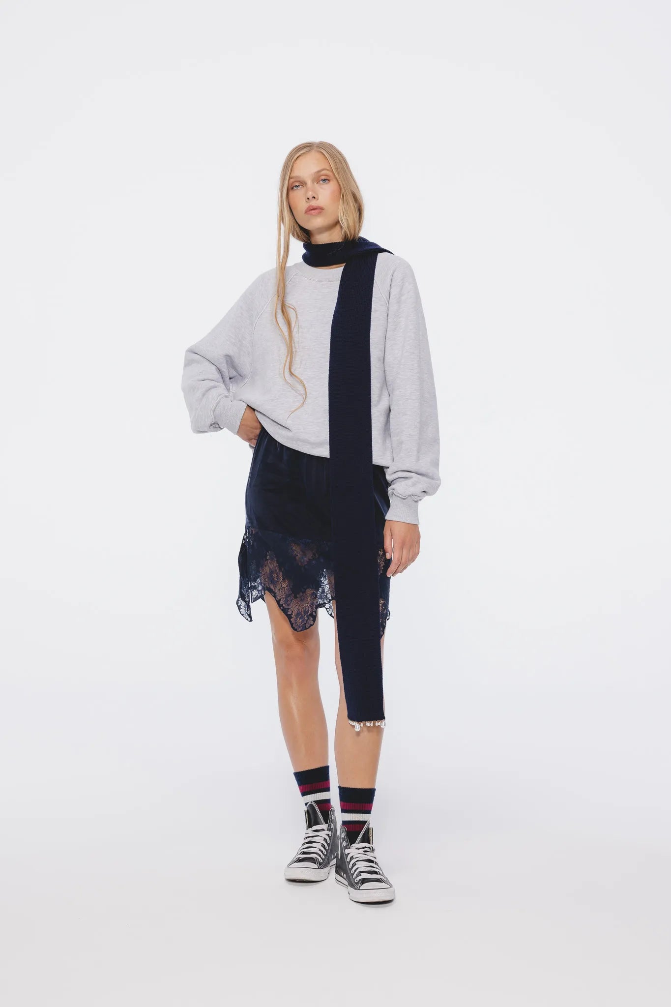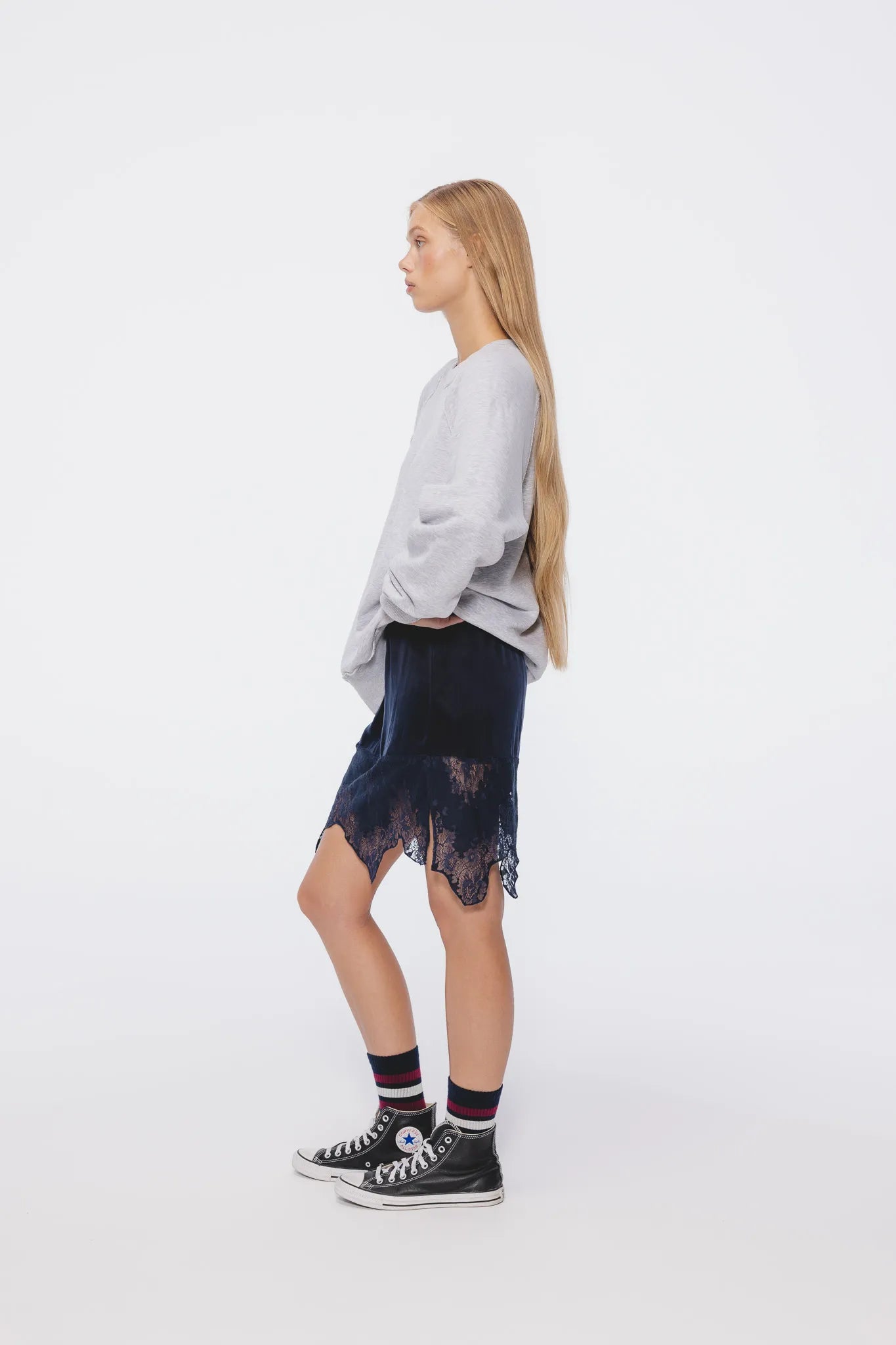 Spódnica Milena w głębokim granatowym kolorze to połączenie klasyki i nowoczesnego detalu. Krój przed kolano podkreśla nogi, a subtelna dekoracyjna tasiemka w pasie dodaje jej elegancji. Model wyróżnia się szeroką koronką u dołu – o nieregularnej linii i kwiatowym wzorze – która nadaje całości lekkości i kobiecego charakteru.