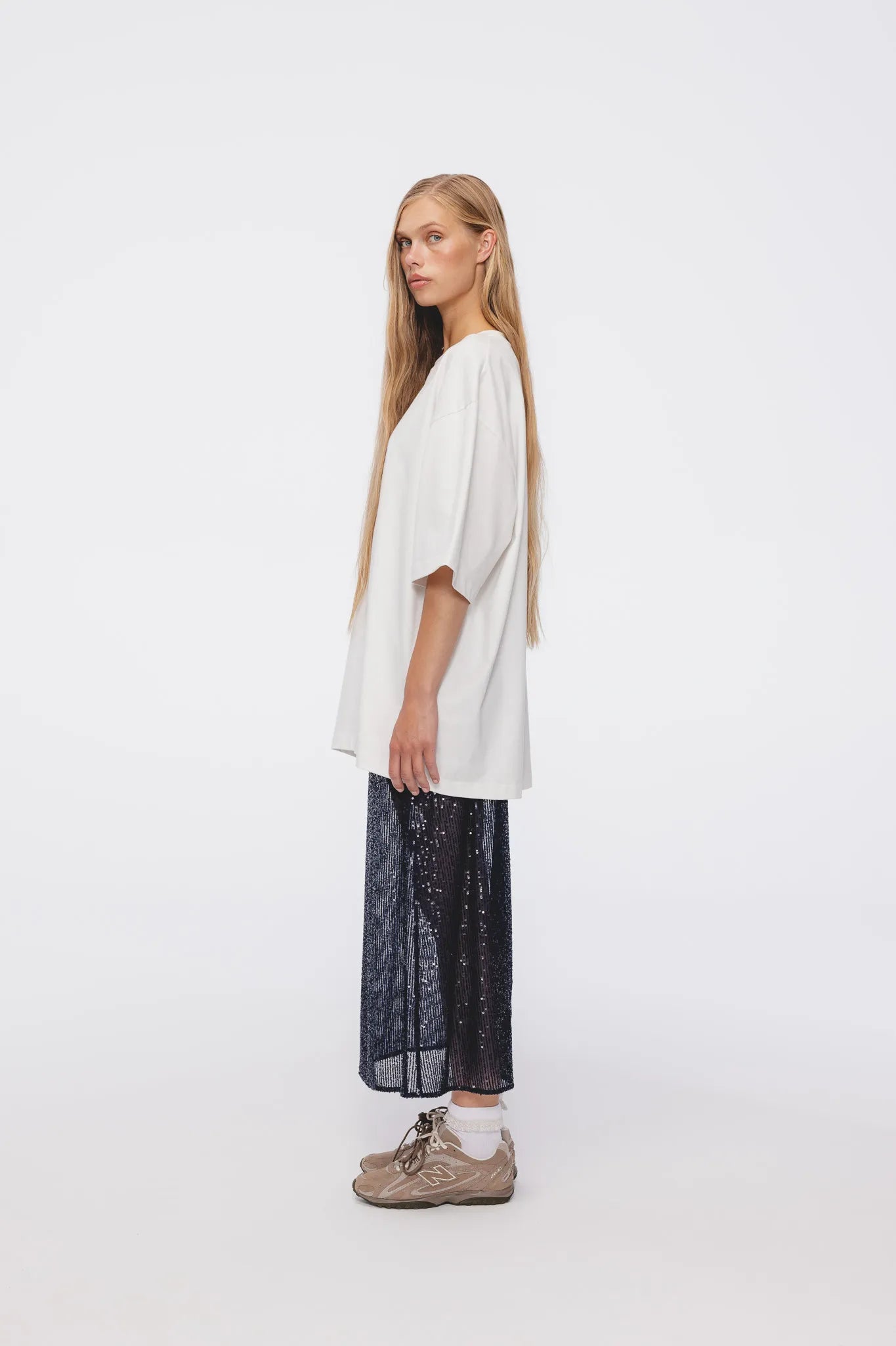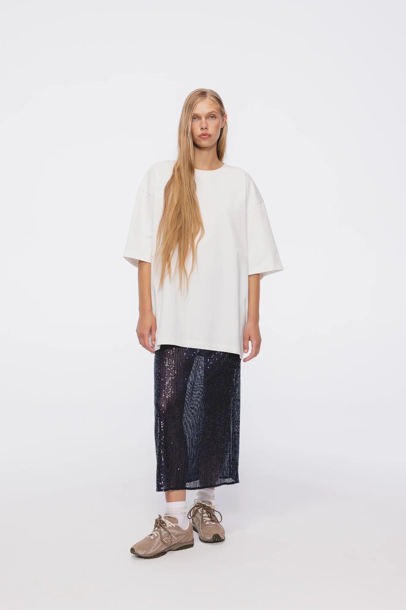 Największym atutem Stelli jest cekinowy blask w granatowym odcieniu, który dodaje stylizacji wyjątkowego uroku i sprawia, że każda kobieta poczuje się w niej pewnie i stylowo. To spódnica, która w zależności od dodatków, może być zarówno elementem casualowego looku z T-shirtem lub bluzą, jak i efektowną bazą wieczorowej stylizacji z marynarką i eleganckimi butami.