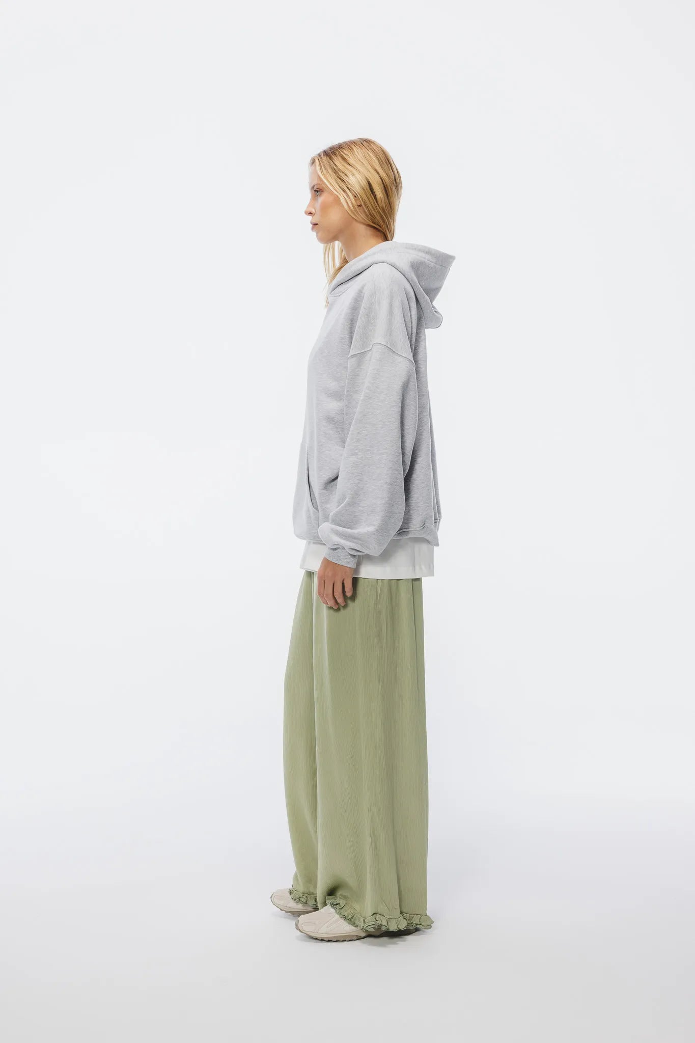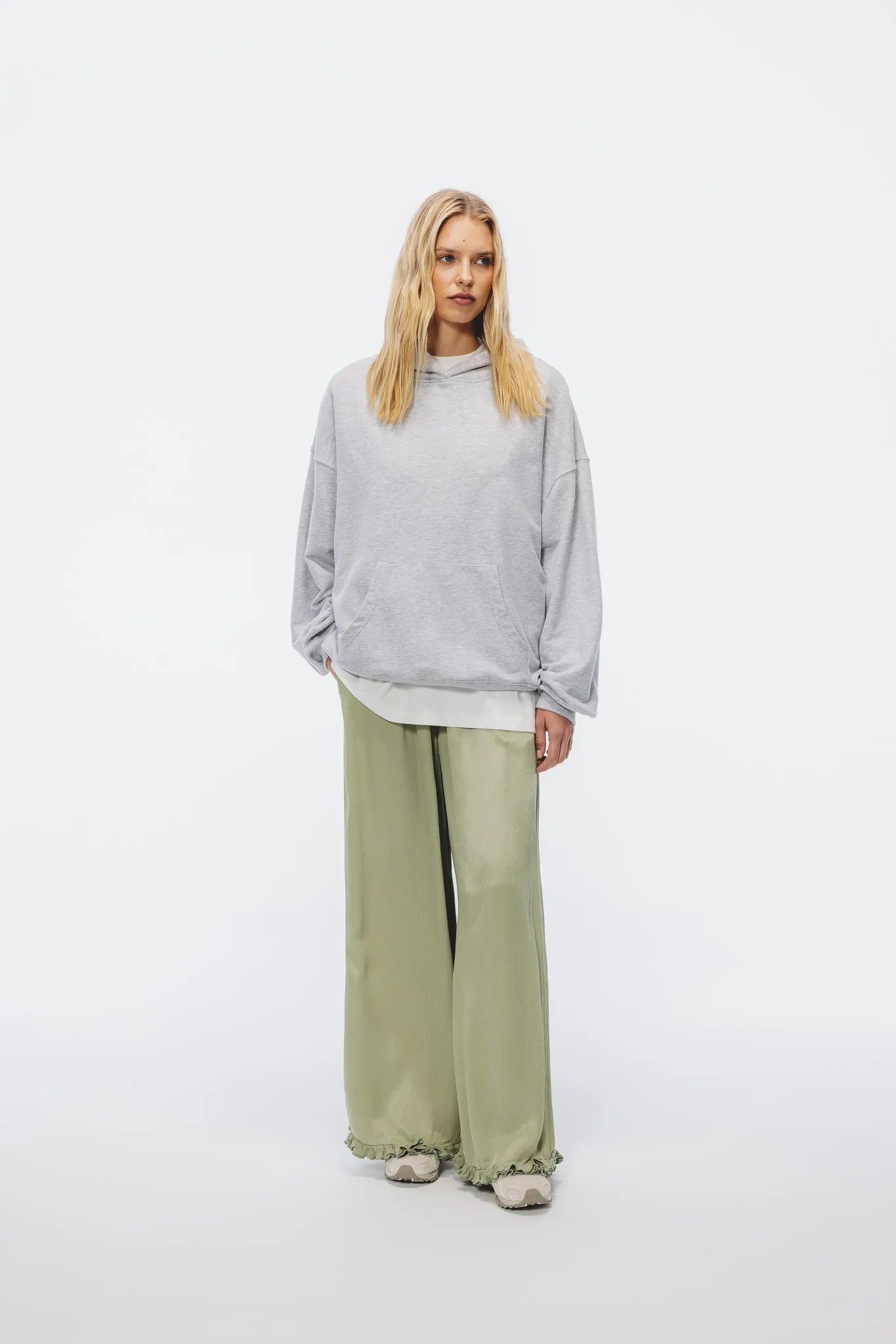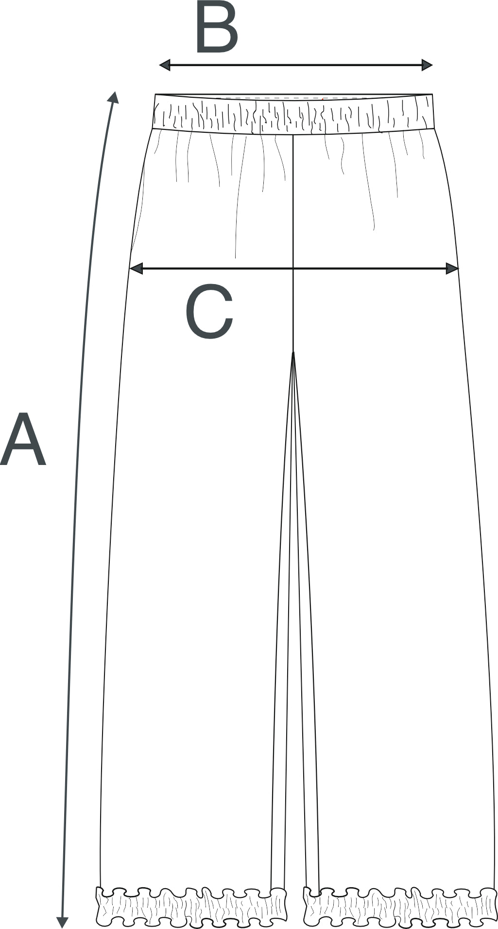 Model Madison ma luźny krój z szeroką nogawką, który miękko układa się na sylwetce i zapewnia pełną swobodę ruchu. Elastyczny pas na gumie gwarantuje komfort i dopasowanie do różnych typów sylwetki, a kieszenie boczne odszyte na czysto podkreślają dopracowanie każdego detalu. Dół spodni ozdobiony jest podwójną falbanką marszczoną po środku, której brzegi wykończone są delikatną mereżką, co dodaje całości lekkości i dziewczęcego uroku.