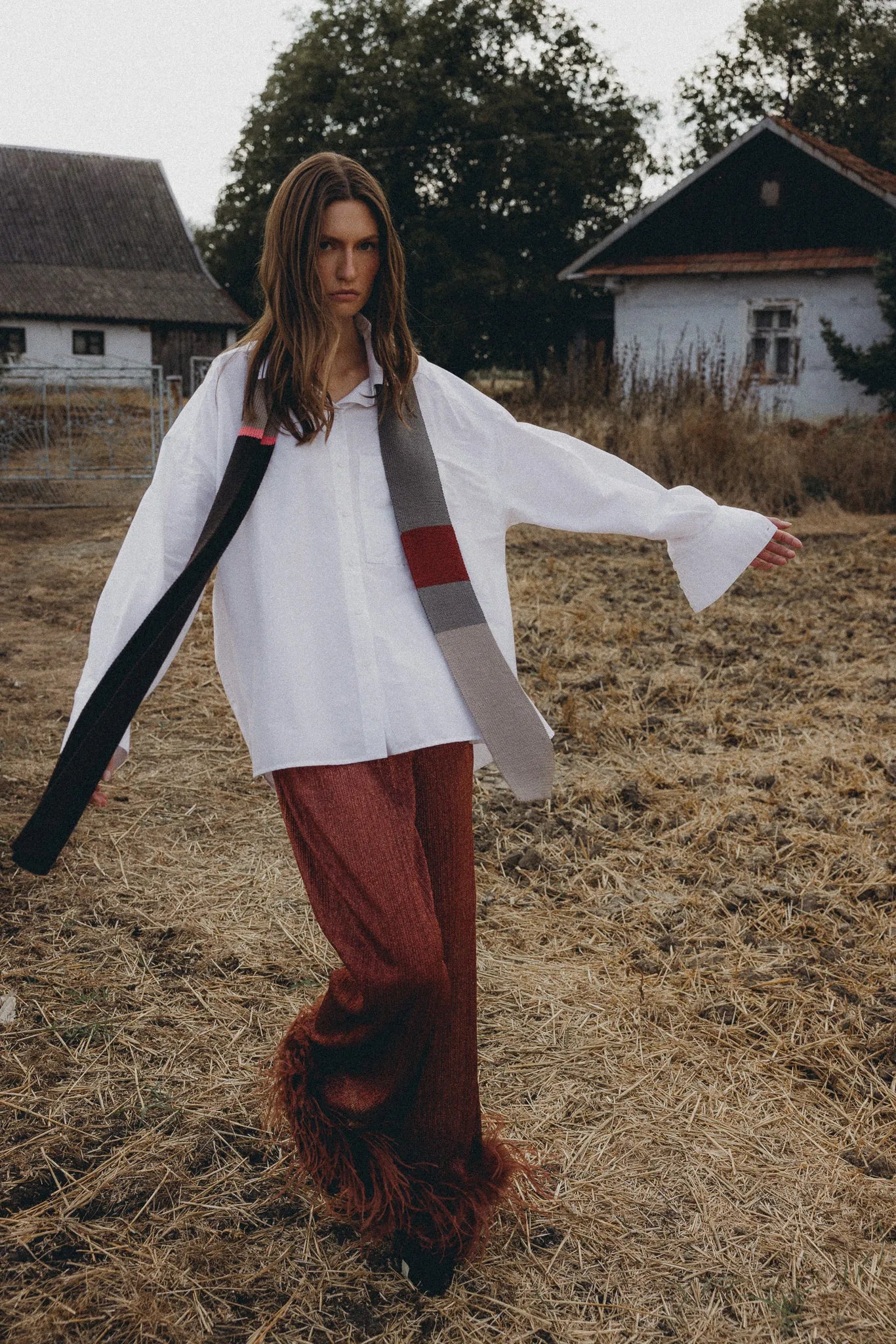 Sewera to nasza interpretacja tradycyjnych ludowych wstążek i kokard, które w dawnych strojach ludowych miały znaczenie zarówno ozdobne, jak i symboliczne. Jego długi, minimalistyczny krój kontrastuje z multikolorowym wykończeniem.