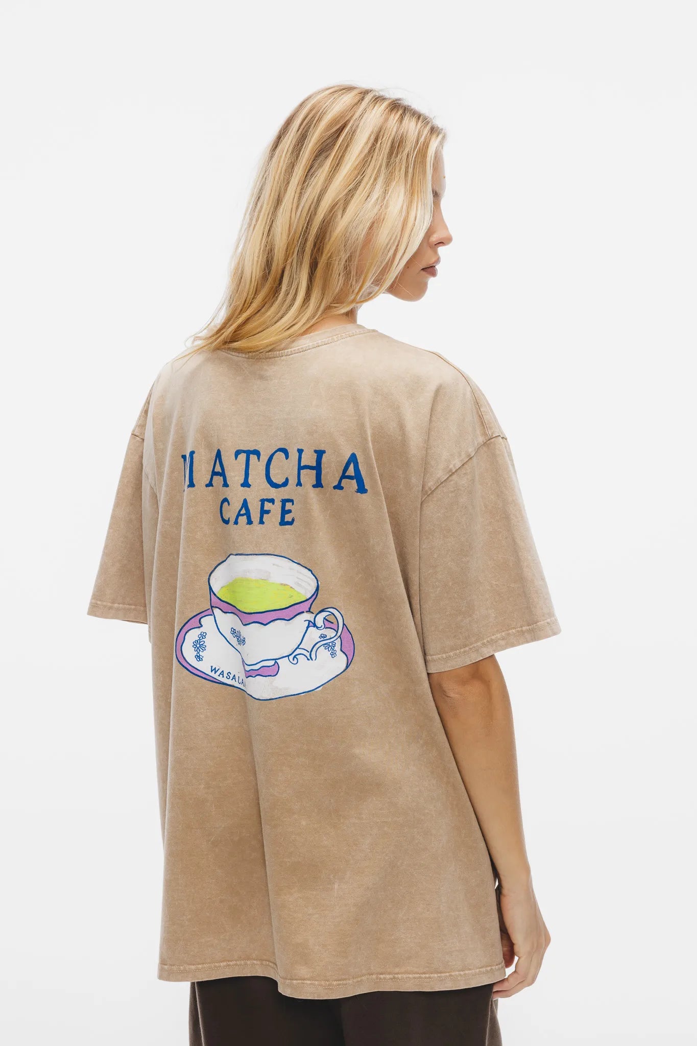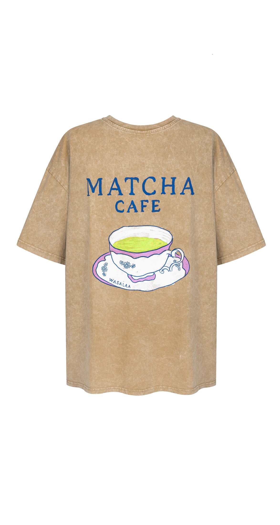Na tyle koszulki znajduje się autorski nadruk – ilustracja filiżanki z zieloną herbatą matcha w odcieniach zieleni, fioletu, granatu i złamanej bieli. Wykonany metodą sitodruku plastizolowego, wyróżnia się wyrazistym, a zarazem subtelnym efektem graficznym. Kompozycja nadruku przyciąga uwagę, a jego centralne umiejscowienie na plecach podkreśla unikalny charakter projektu.