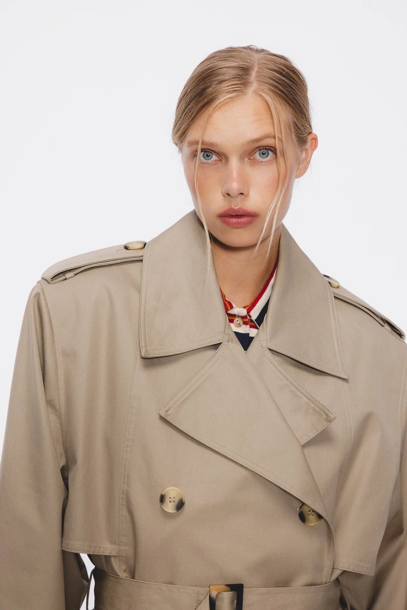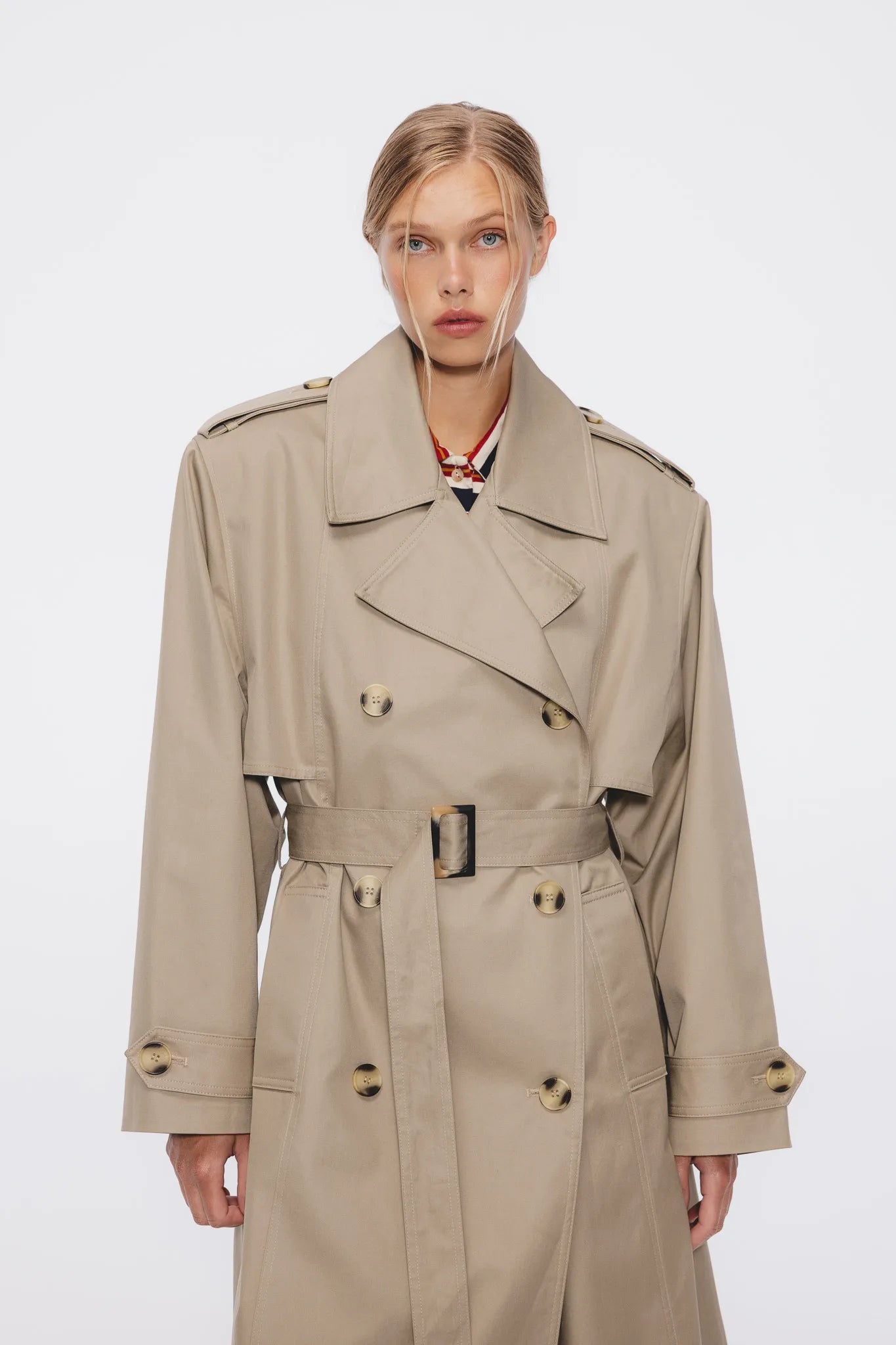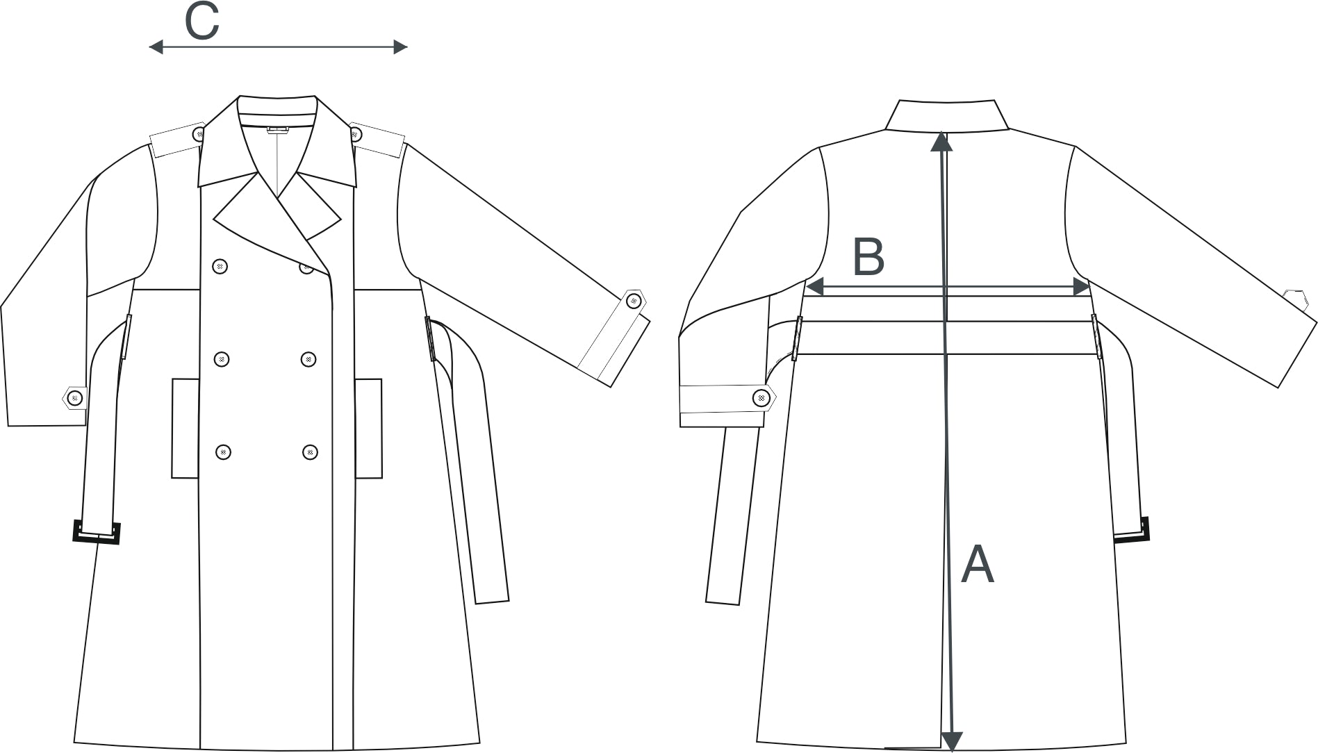 Fason płaszcza opiera się na charakterystycznych detalach: dwurzędowe logowane guziki, pas z klamrą podkreślający talię oraz pagony na ramionach nadające mu militarny akcent. Dodatkowo posiada kołnierz z klapami, karczek z tyłu, a także rozporek z tyłu, który zapewnia swobodę ruchów.
