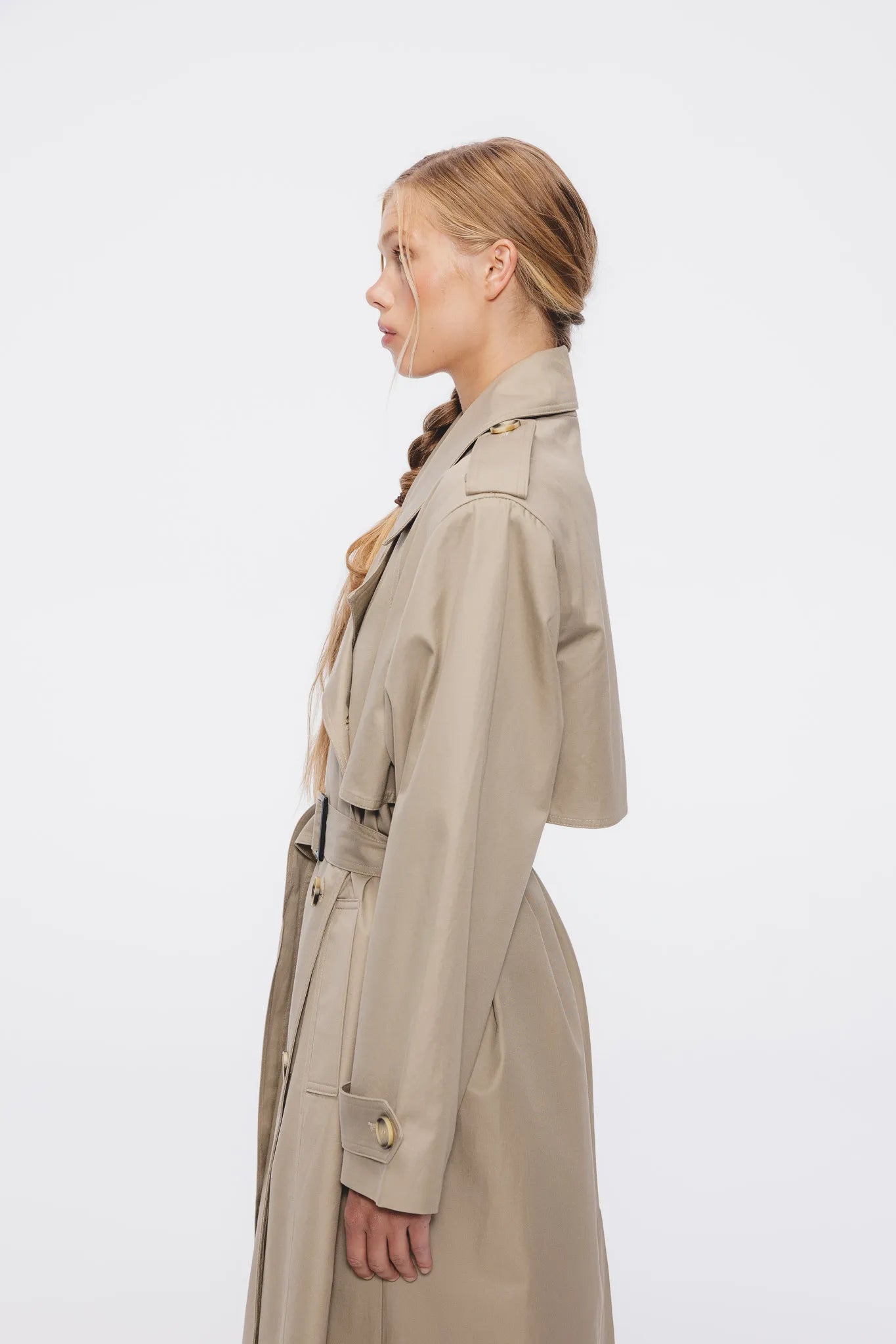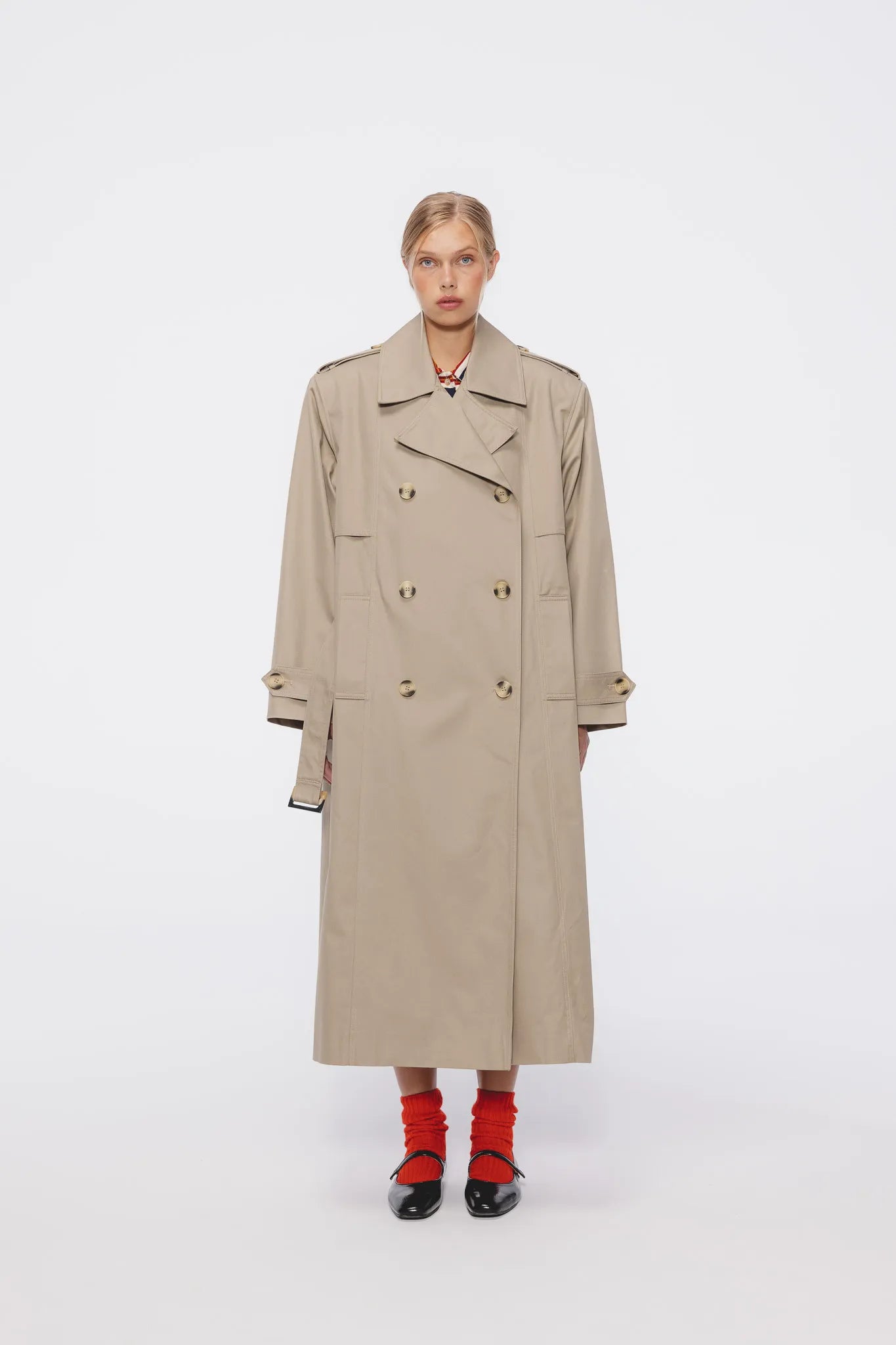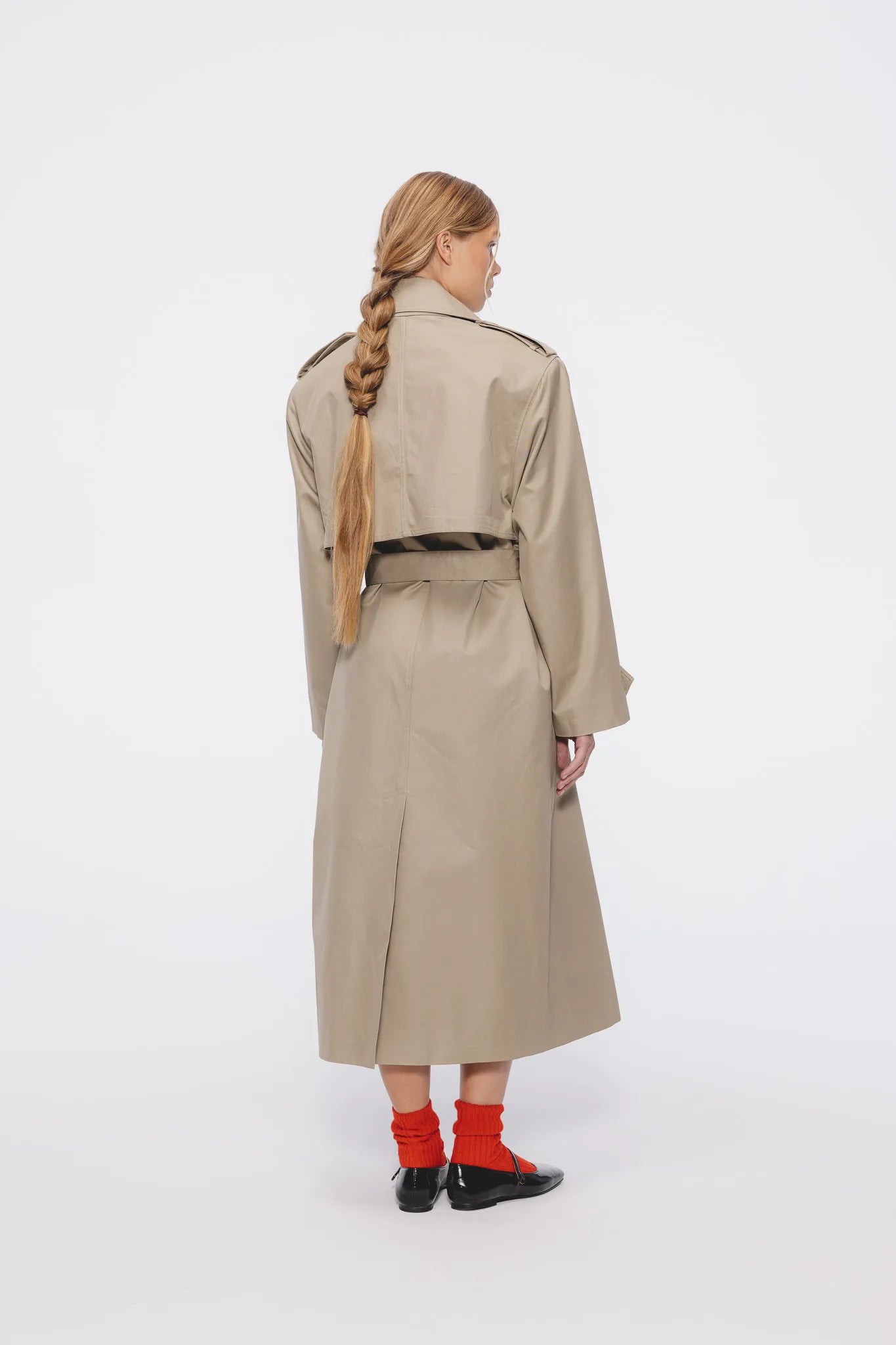 Fason płaszcza opiera się na charakterystycznych detalach: dwurzędowe logowane guziki, pas z klamrą podkreślający talię oraz pagony na ramionach nadające mu militarny akcent. Dodatkowo posiada kołnierz z klapami, karczek z tyłu, a także rozporek z tyłu, który zapewnia swobodę ruchów.