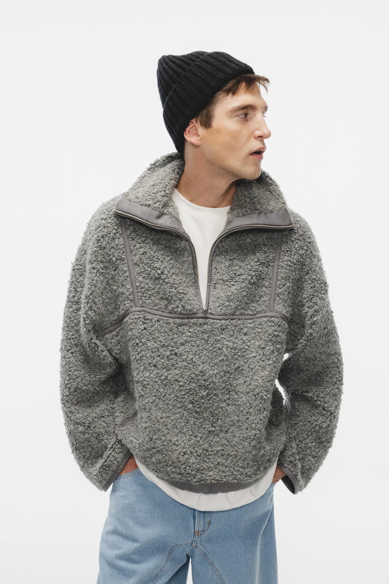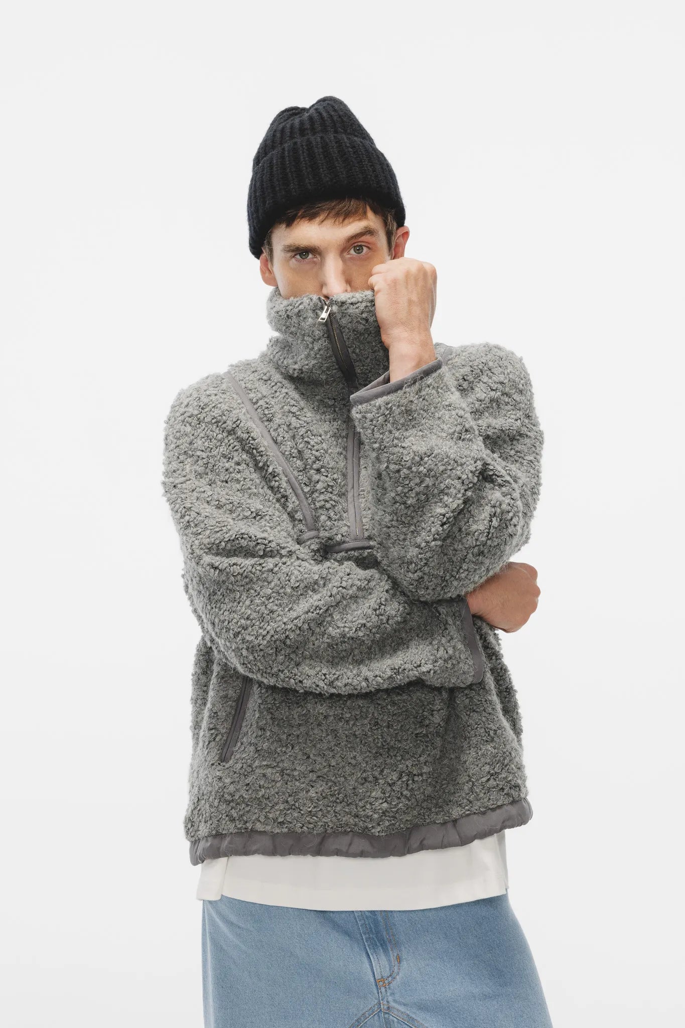 Wykonana z miękkiej, mięsistej dzianiny typu teddy, bluza otula ciepłem niczym futrzany koc. Wysoki kołnierz z krótkim zamkiem chroni przed wiatrem, a kontrastowe lamówki z lyocellu podkreślają precyzję wykończenia i dodają całości strukturalnego charakteru.