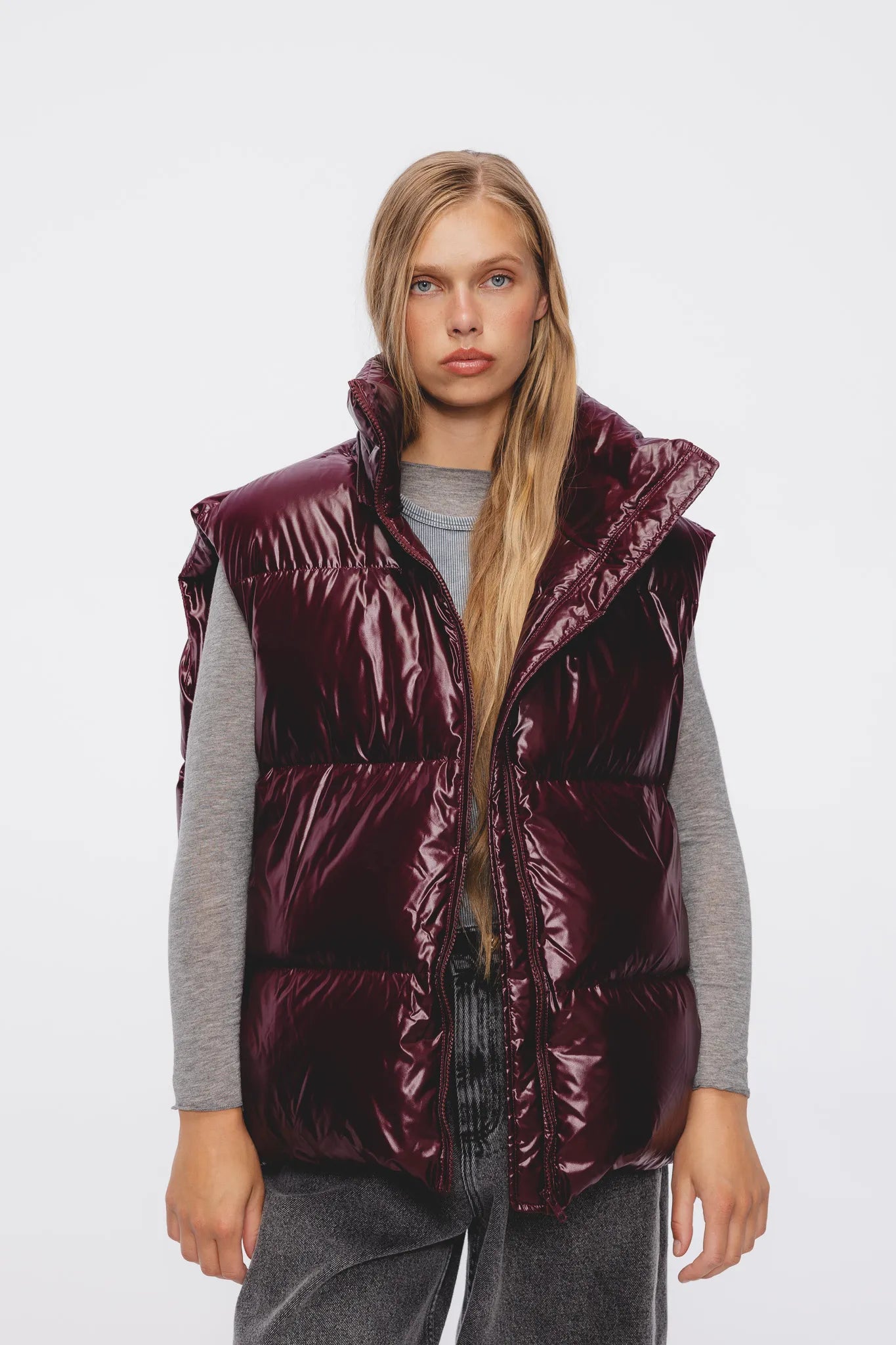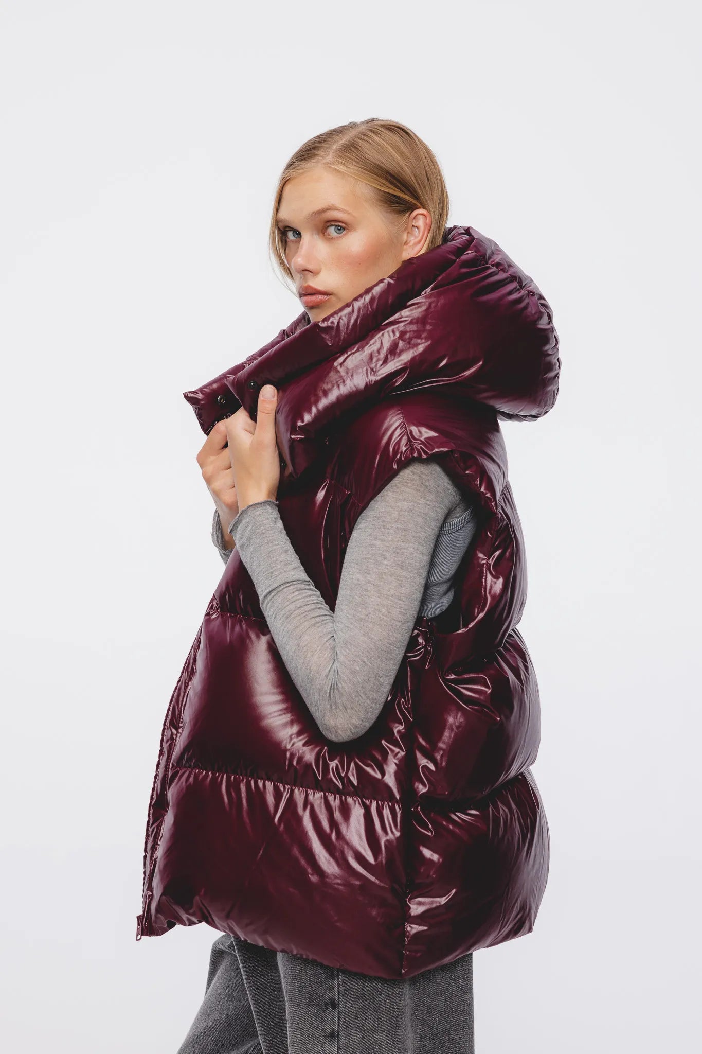 Władzia to kamizelka puchowa o głębokim wiśniowym kolorze. Doskonale sprawdzi się jako uzupełnienie całorocznej szafy. Klasyczne, poprzeczne pikowanie, miękki, lekko połyskujący materiał oraz ocieplane kieszenie zewnętrzne to cechy Władzi.