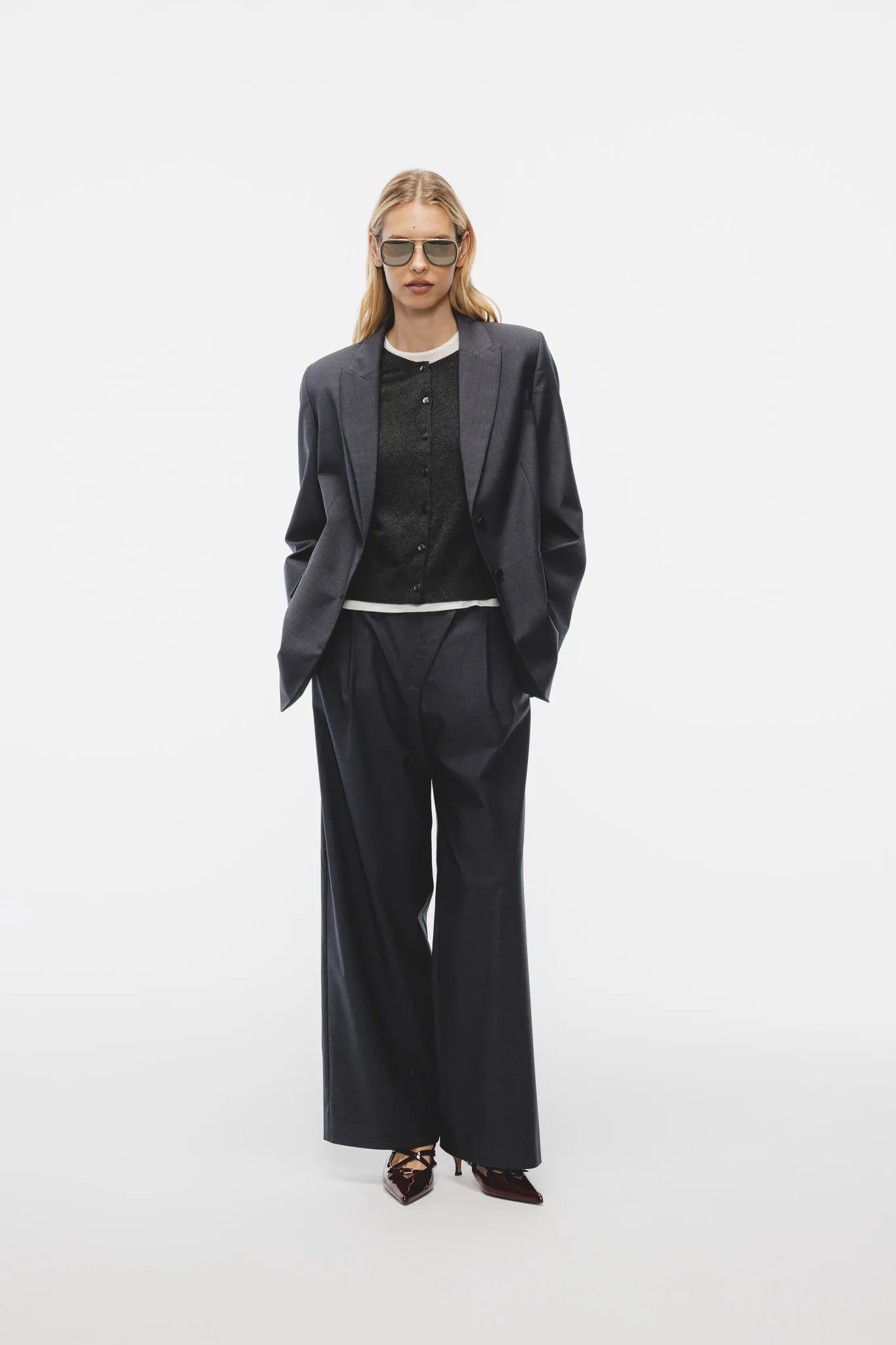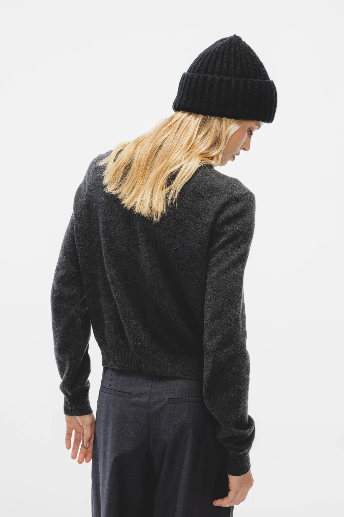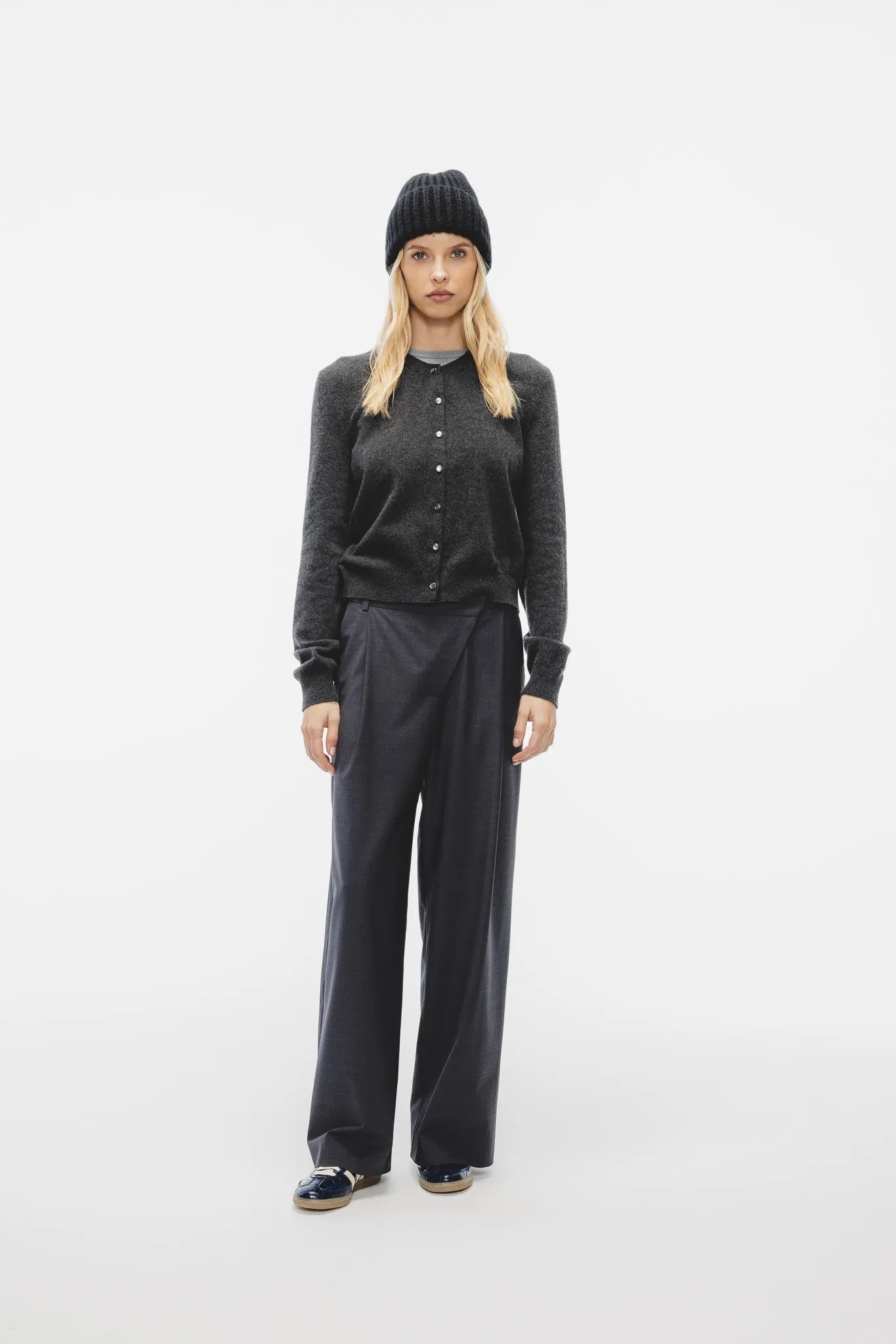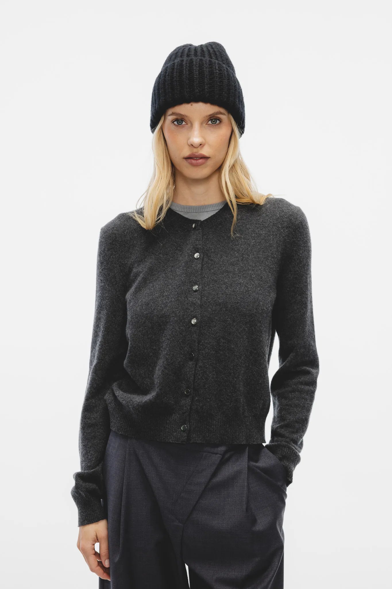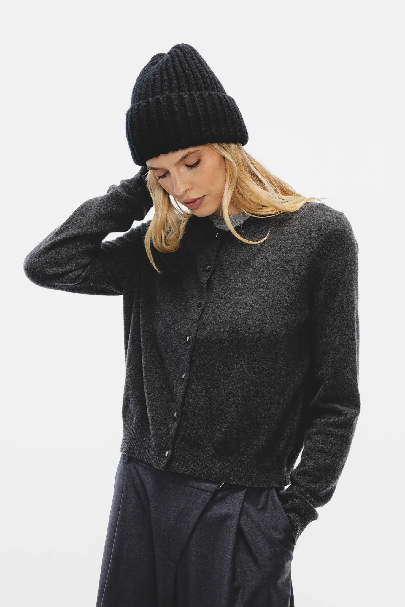 Sweter Ewela w kolorze grafitowego melanżu to klasyczny kardigan, który łączy ponadczasową elegancję z luksusową jakością. Wykonany z wysokogatunkowej mieszanki wełny merino ultrafine i kaszmiru, zachwyca miękkością, lekkością i doskonałym komfortem noszenia.