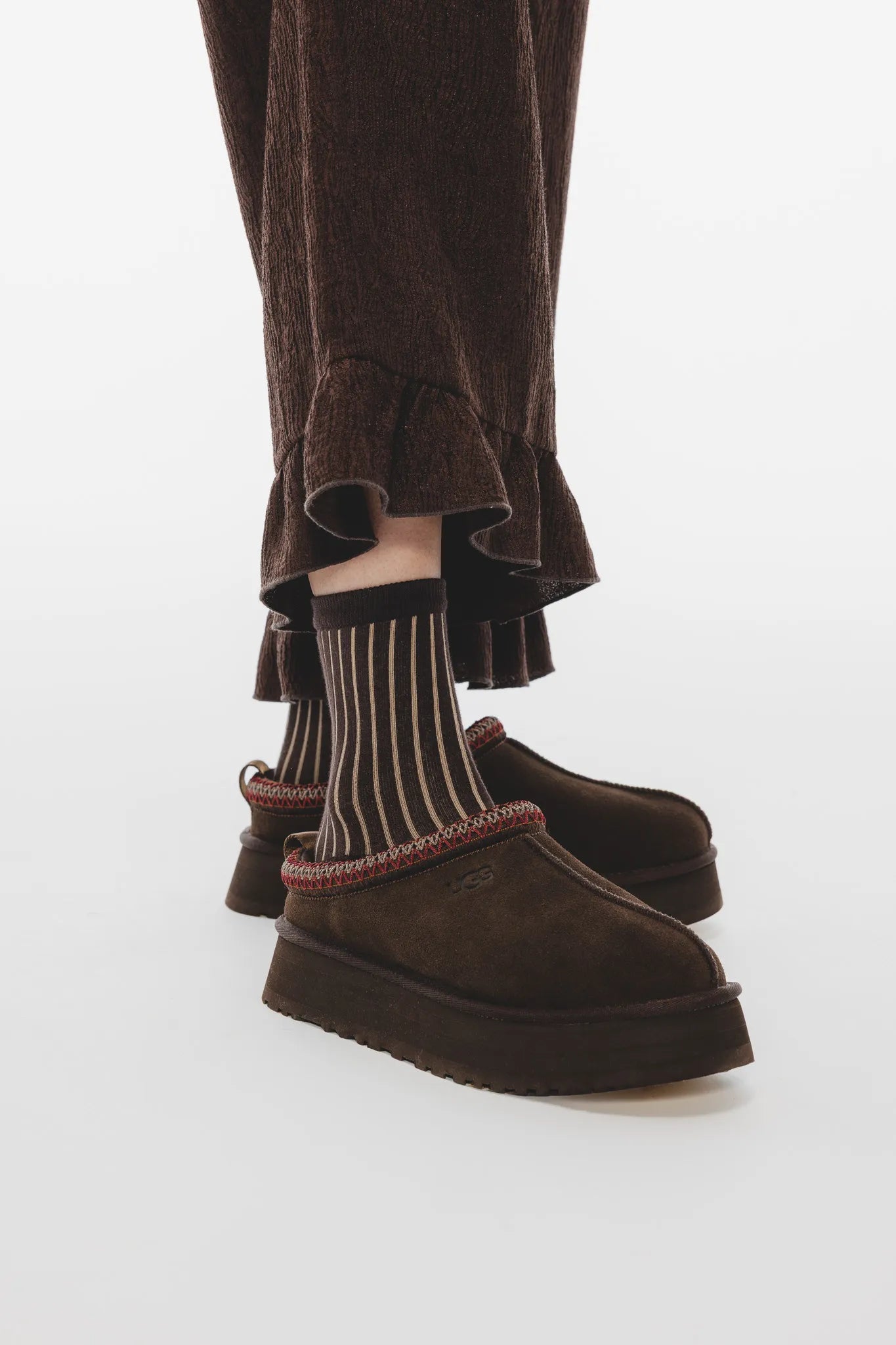 Dzięki połączeniu włókien skarpety są przyjemne w dotyku, nie uciskają i dobrze trzymają się na stopie. Ich kolor gorzkiej czekolady - głęboki, ciepły brąz z delikatnymi, jaśniejszymi liniami jest neutralny i łatwy do łączenia. Dwa rozmiary do wyboru — dopasowane tak, aby skarpety dobrze układały się na różnych kształtach stopy. Ajda są idealne do codziennych stylizacji.