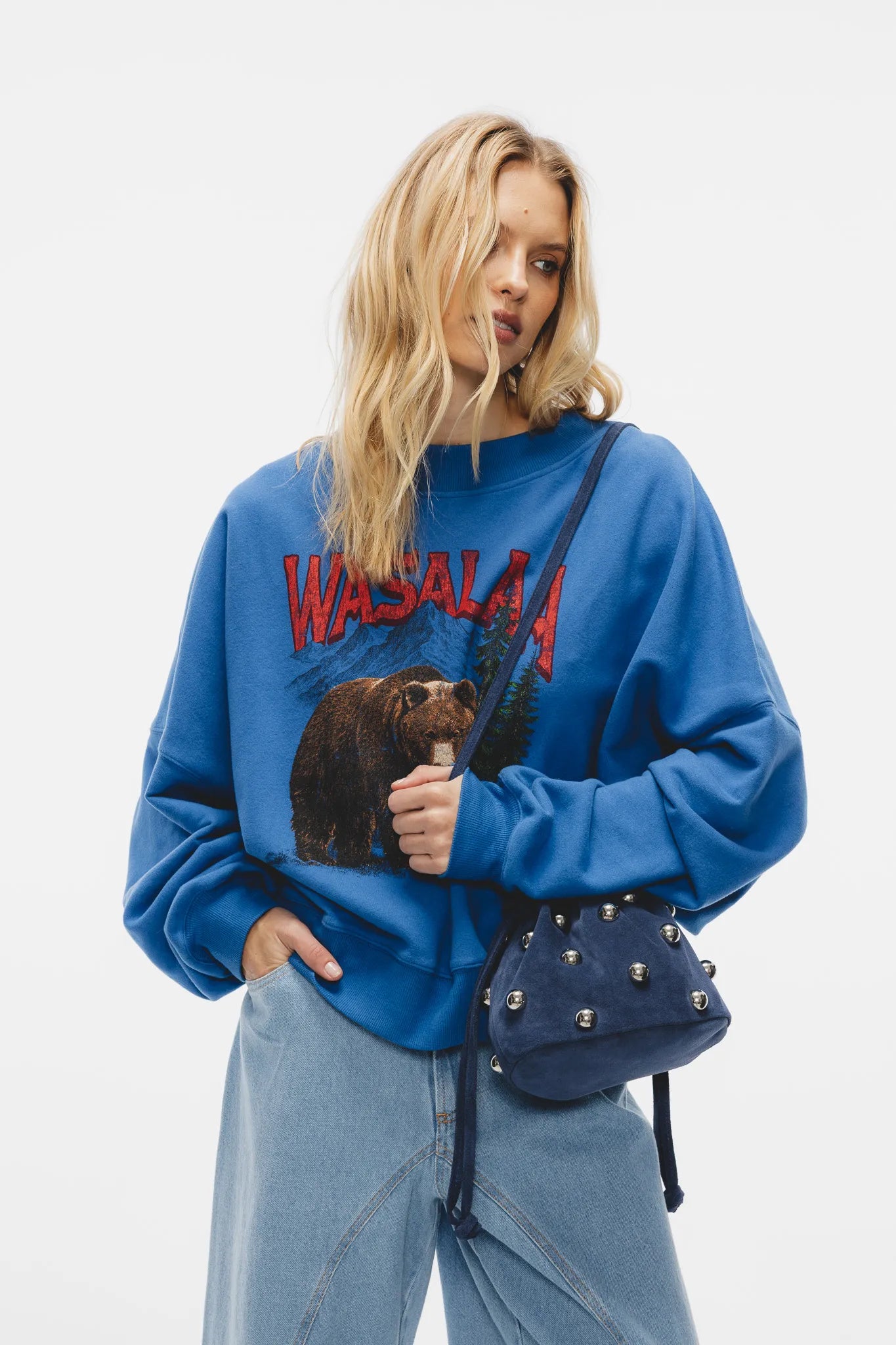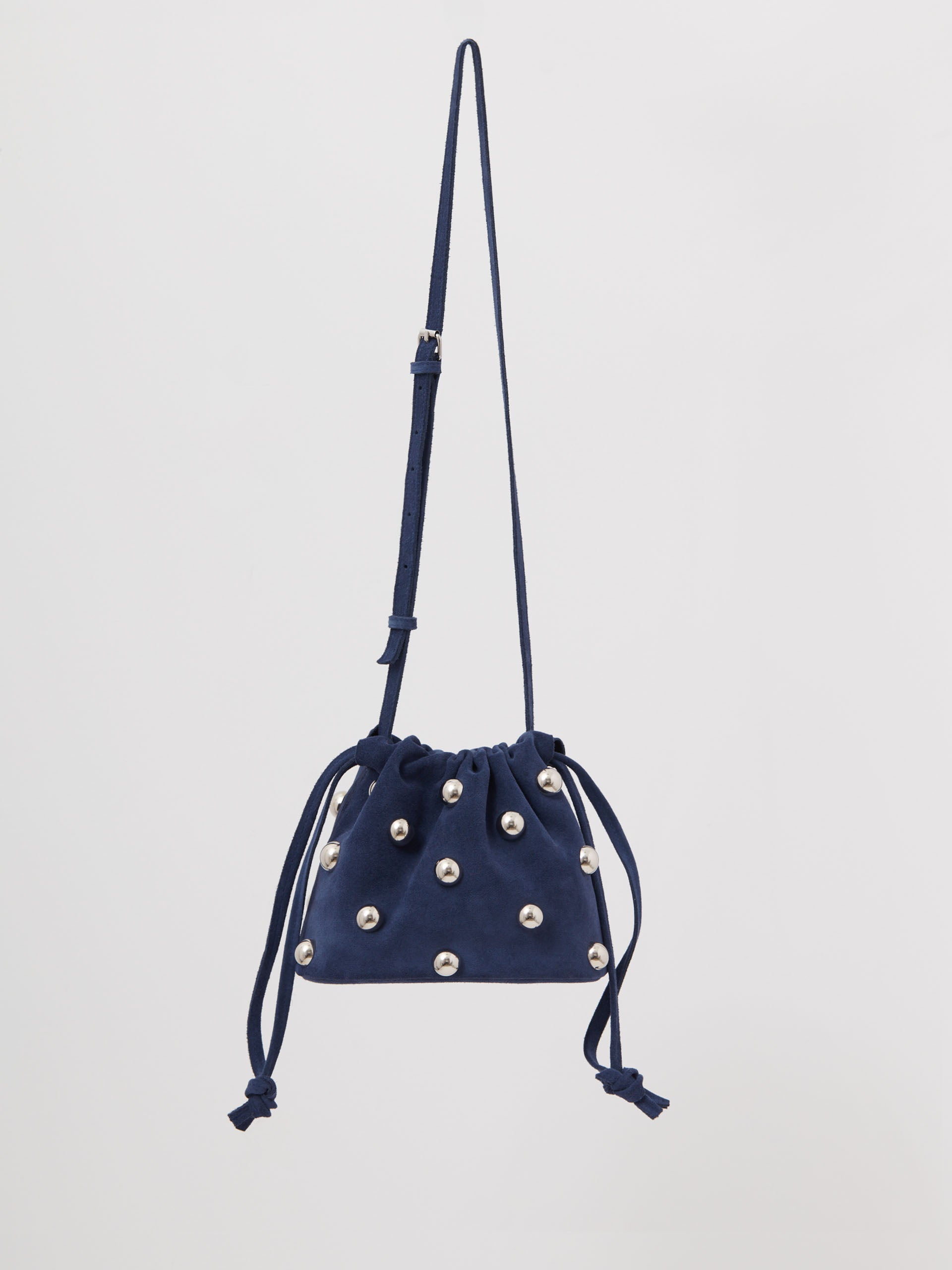 Charlotte to elegancka torebka typu worek, wykonana z miękkiej skóry zamszowej w głębokim, szafirowym odcieniu. Jej minimalistyczną formę przełamują srebrne, okrągłe nity rozmieszczone na całej powierzchni, dodając całości nowoczesnego charakteru i odrobiny rockowego akcentu.