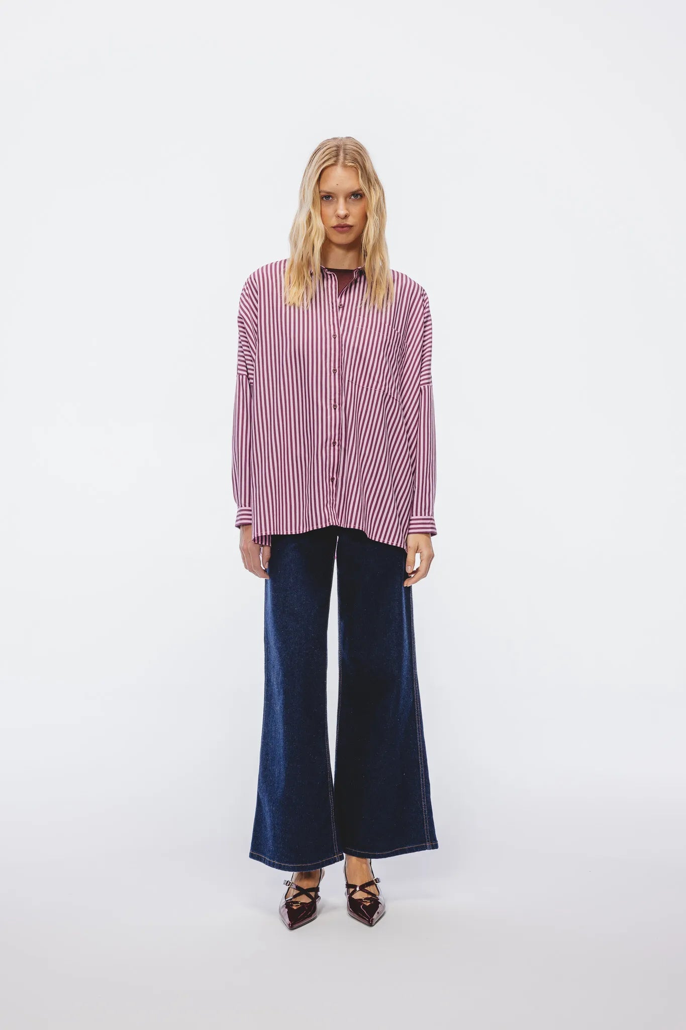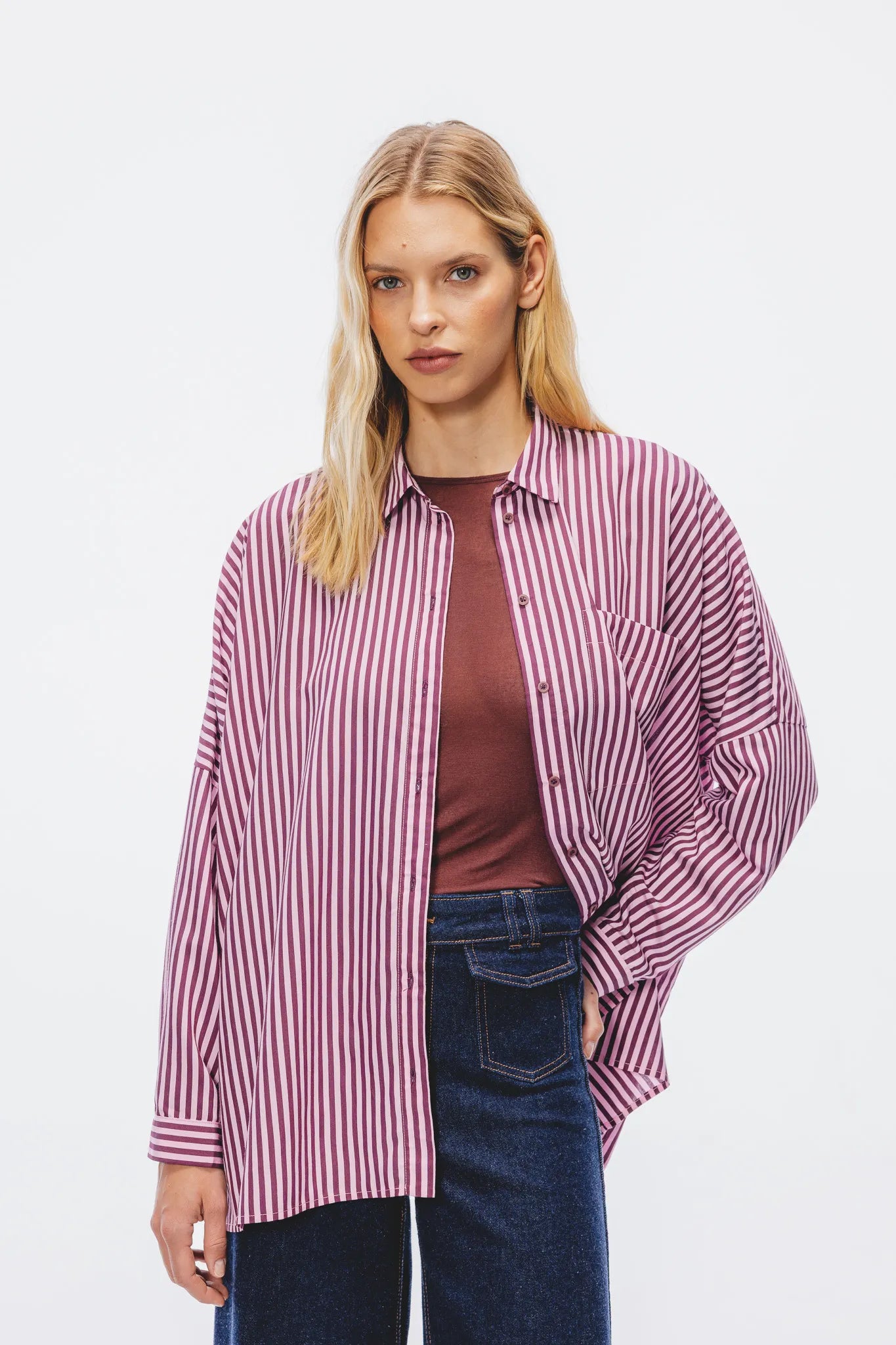 Koszula zapinana jest na perłowe guziki, posiada delikatnie obniżoną linię ramion, co potęguje efekt nonszalanckiego oversize’u. Dół lekko zaokrąglony i wydłużony z tyłu, dzięki czemu model pięknie prezentuje się zarówno wpuszczony w spodnie, jak i noszony luźno.