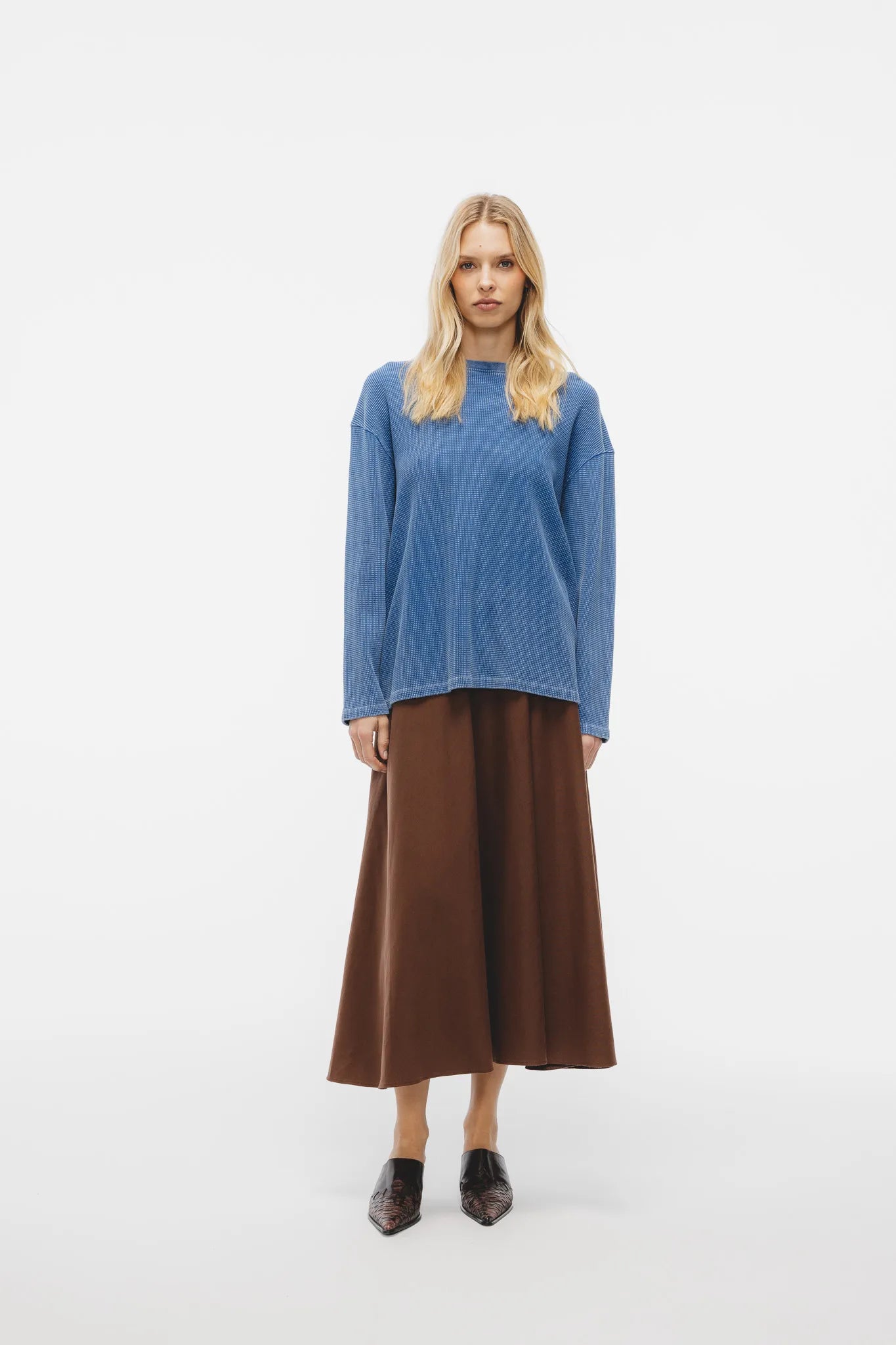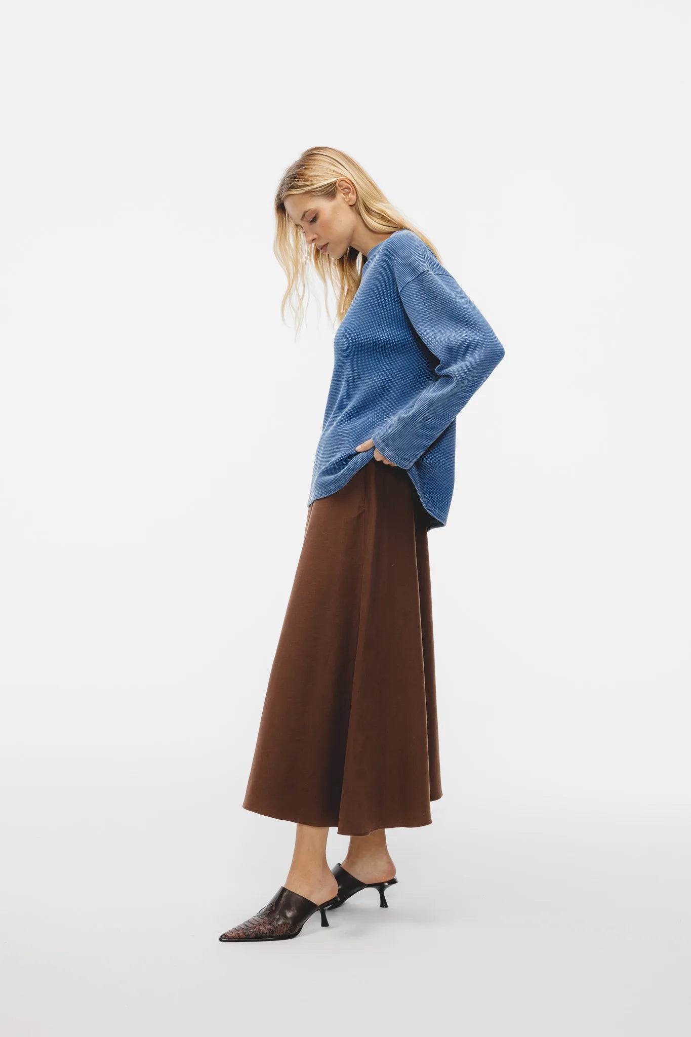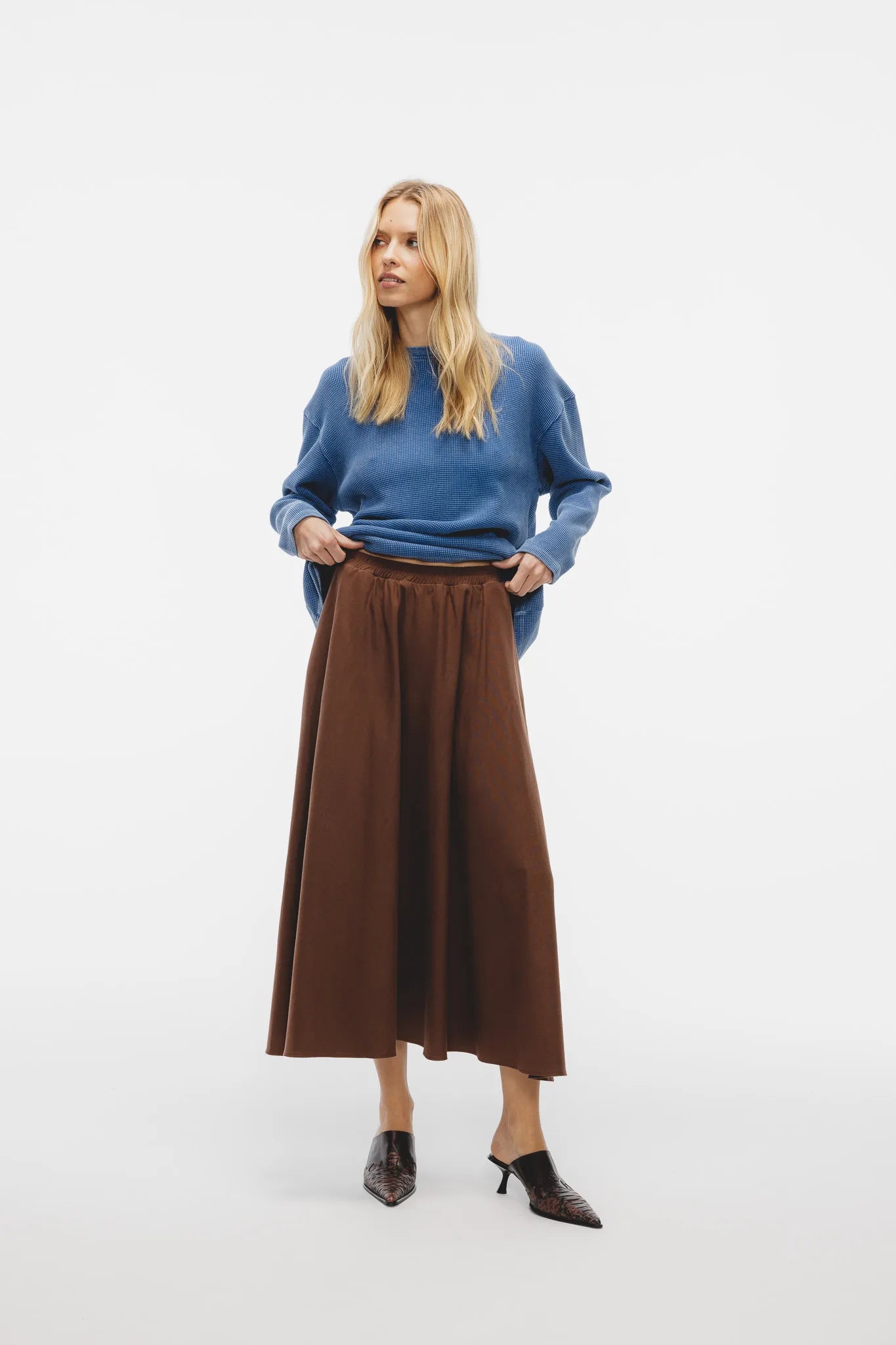 Tkanina jest lekko mięsista, z subtelnym, naturalnym połyskiem. Kolor: głęboki brąz, ciepły i stonowany. Uniwersalny odcień, który doskonale współgra z bielą, czernią, beżami, oliwką czy odcieniami ziemi. To wygodna, codzienna spódnica o kobiecej formie. Naturalna, łatwa w stylizowaniu i idealna na cały rok — łączy komfort z charakterystycznym minimalizmem.