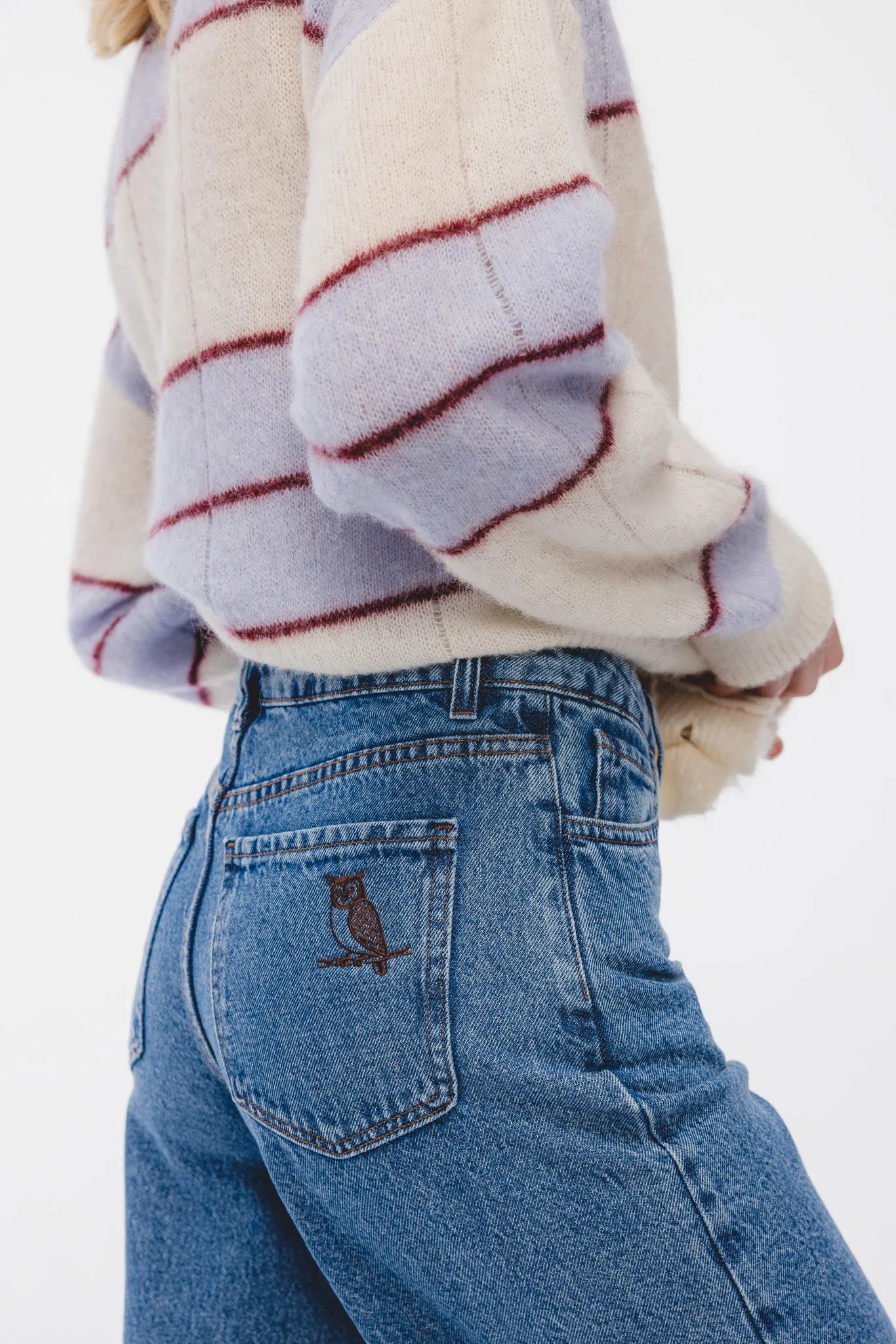 • Spodnie jeansowe Edyta w kolorze spranego ciemnoniebieskiego denimu to klasyk, który stanie się niezawodną bazą w Twojej codziennej garderobie. Ich charakterystycznym detalem jest subtelny haft sowy na tylnej kieszeni, dodający im wyjątkowego wykończenia.