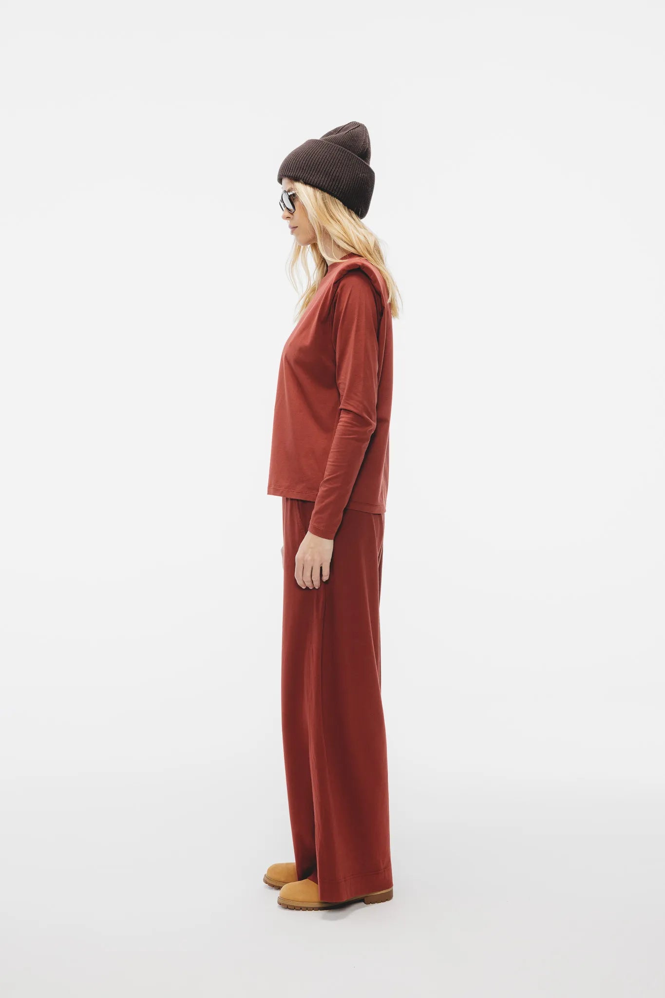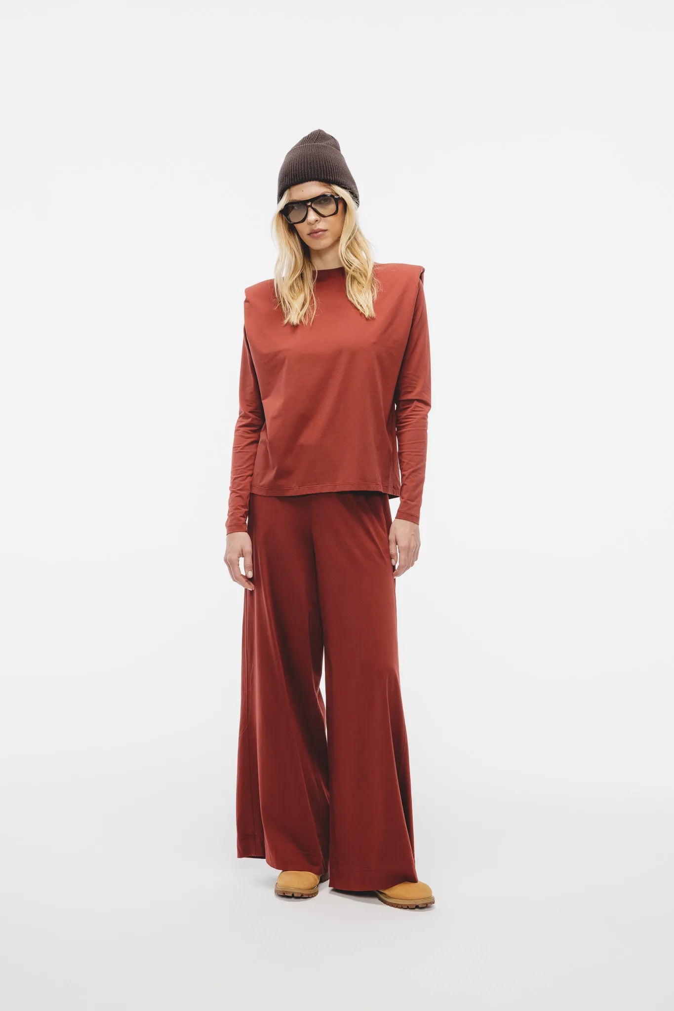 Ceglany odcień materiału dodaje spodniom wyrazistości i ciepła, a jednocześnie pozostaje na tyle stonowany, że łatwo łączy się z innymi elementami garderoby — od basicowych T-shirtów po oversize’owe bluzy czy lekkie koszule.