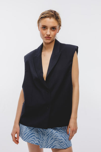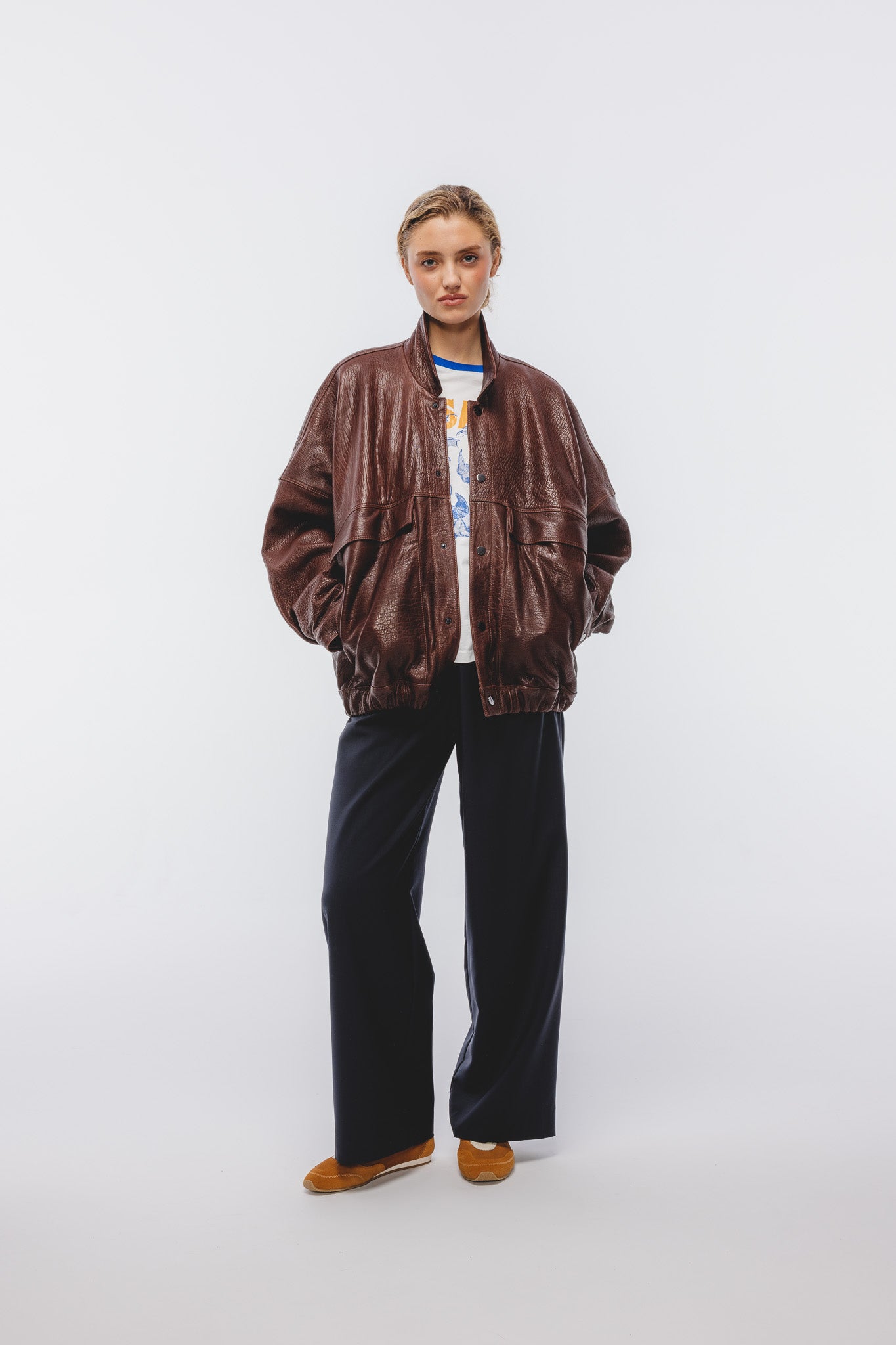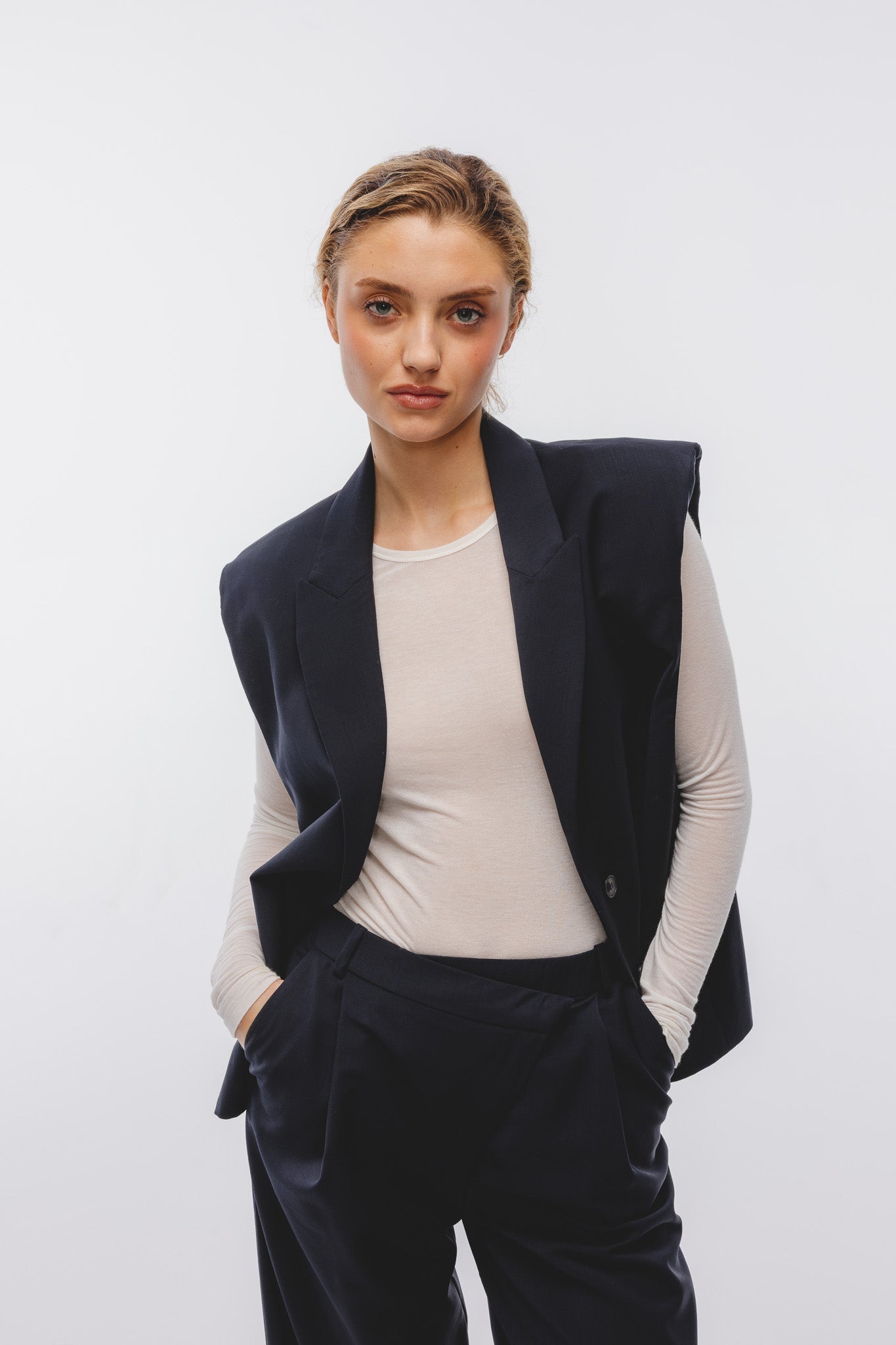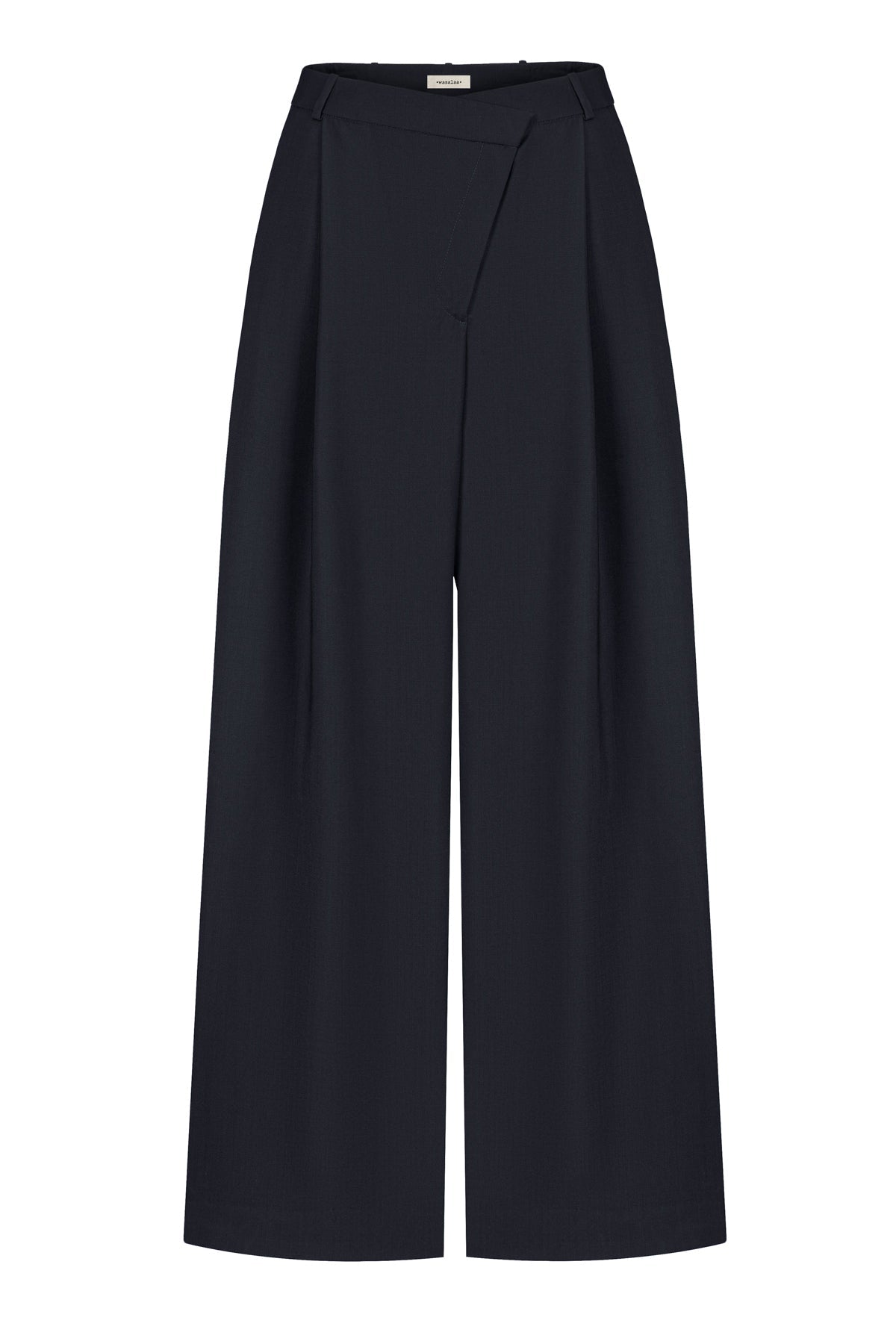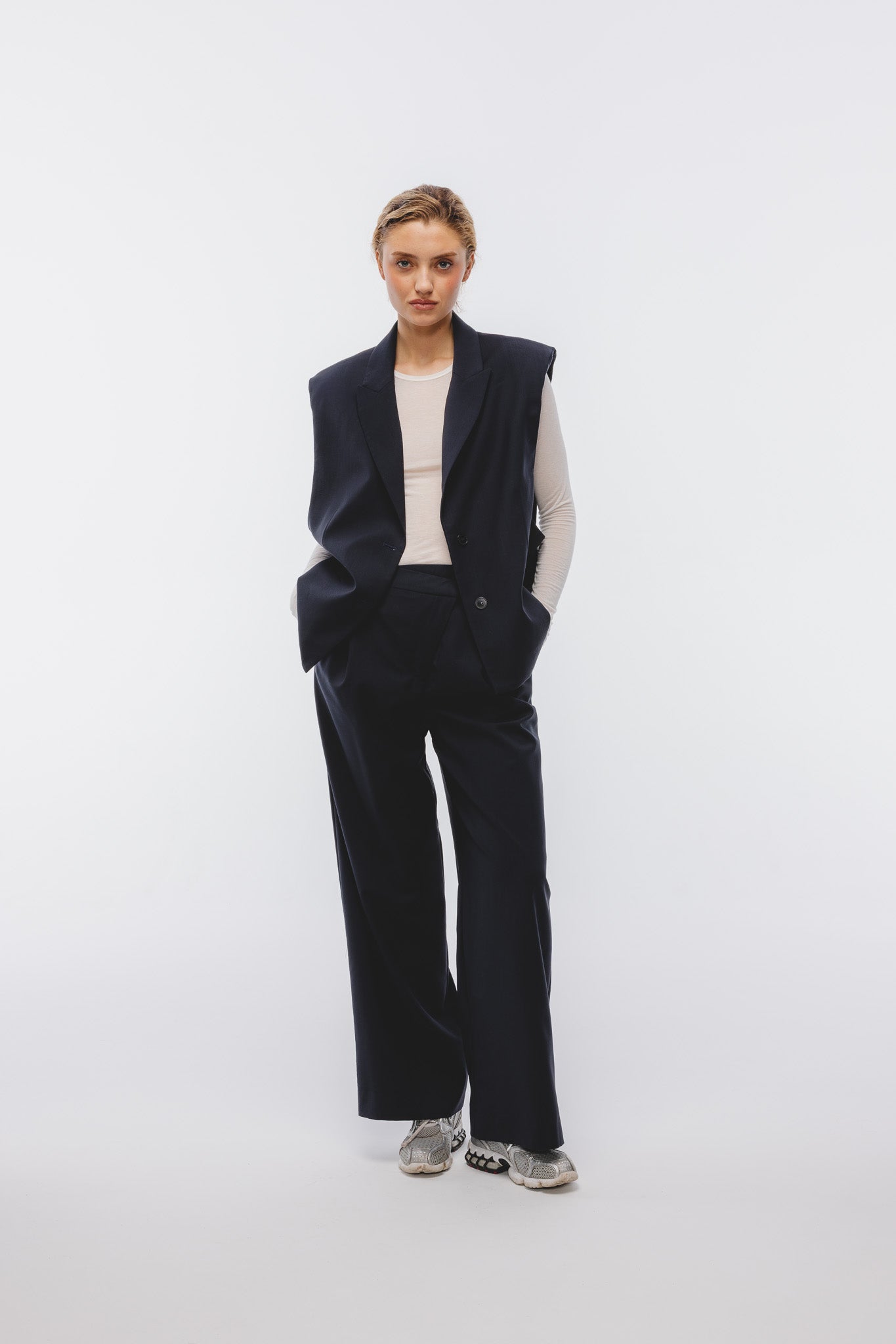 Spodnie Molly w ciemnogranatowym kolorze to połączenie elegancji i wygody. Oversize’owy krój i szerokie nogawki wpisują się w aktualne trendy, a asymetryczne przeszycie rozporka dodaje im oryginalności. Wykonane z wełny, zapewniają komfort noszenia i funkcję termoregulacji – zimą chronią przed chłodem, latem pozwalają skórze oddychać.