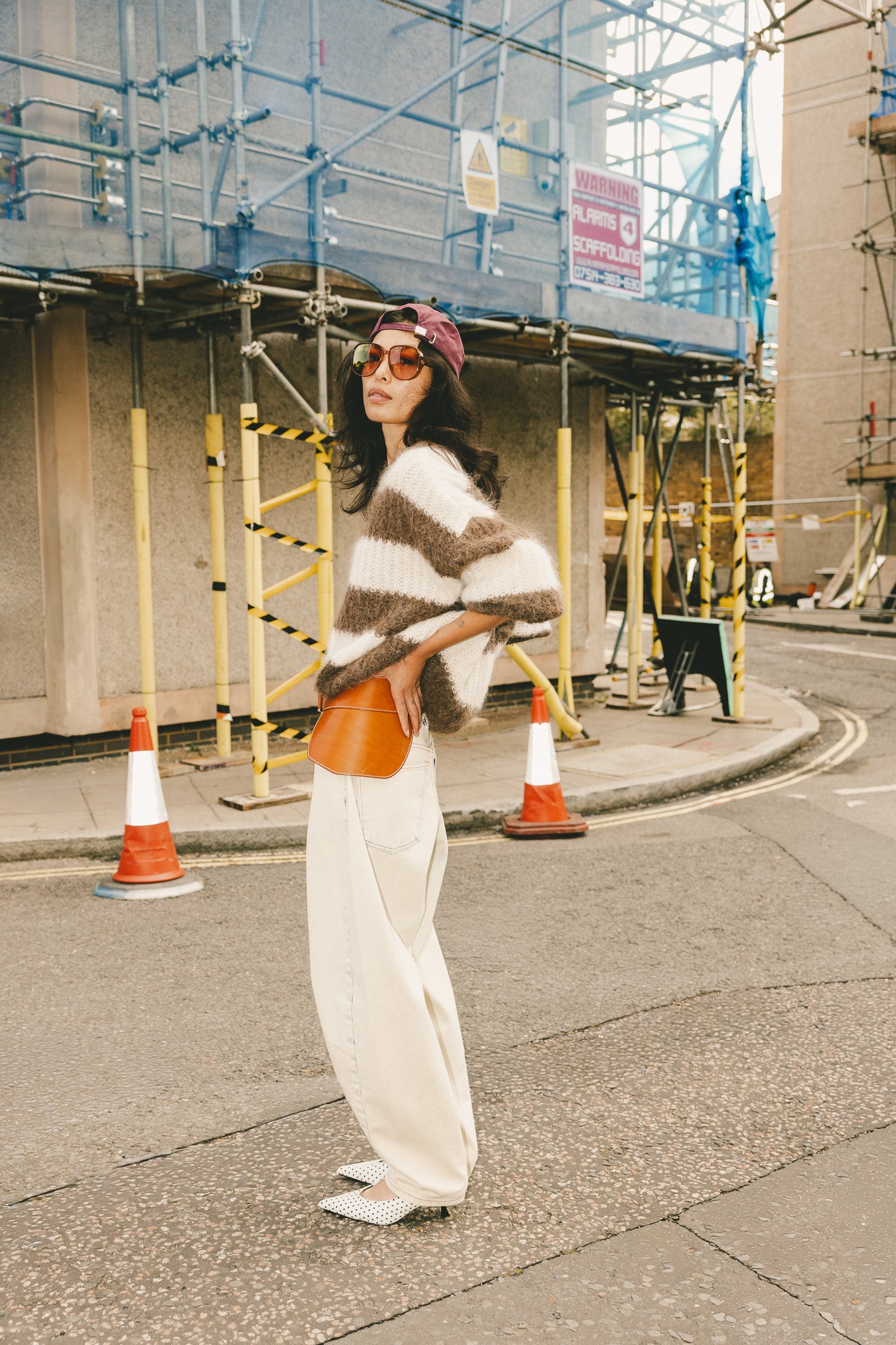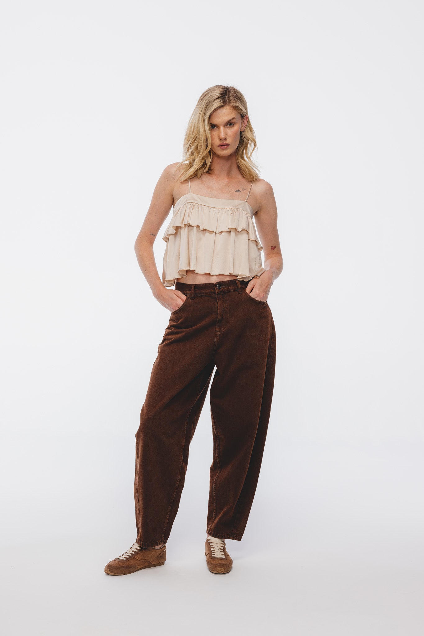 Omena to jeansy o fasonie balloon, które wyróżniają się charakterystycznym bocznym szwem przechodzącym na przód nogawki. Ich luźny krój, zwężający się ku dołowi, świetnie wpisuje się w aktualne trendy, a jednocześnie pozostaje komfortowy i ponadczasowy.