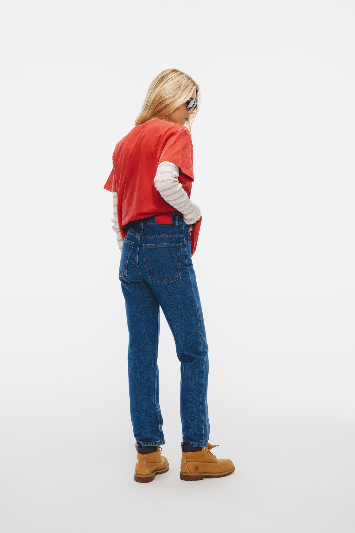 Denim z czystej bawełny 100% — stabilny i oddychający. Z czasem dopasowuje się do indywidualnego kształtu ciała. Głęboki ciemny niebieski, klasyczny dla jeansu. Uniwersalny odcień, który łączy się zarówno z naturalnymi kolorami ziemi, jak i z czernią, bielą czy intensywniejszymi barwami. To codzienne spodnie, które łączą wygodę i klasykę. Solidne, naturalne — idealna baza do minimalistycznych i ponadczasowych stylizacji.