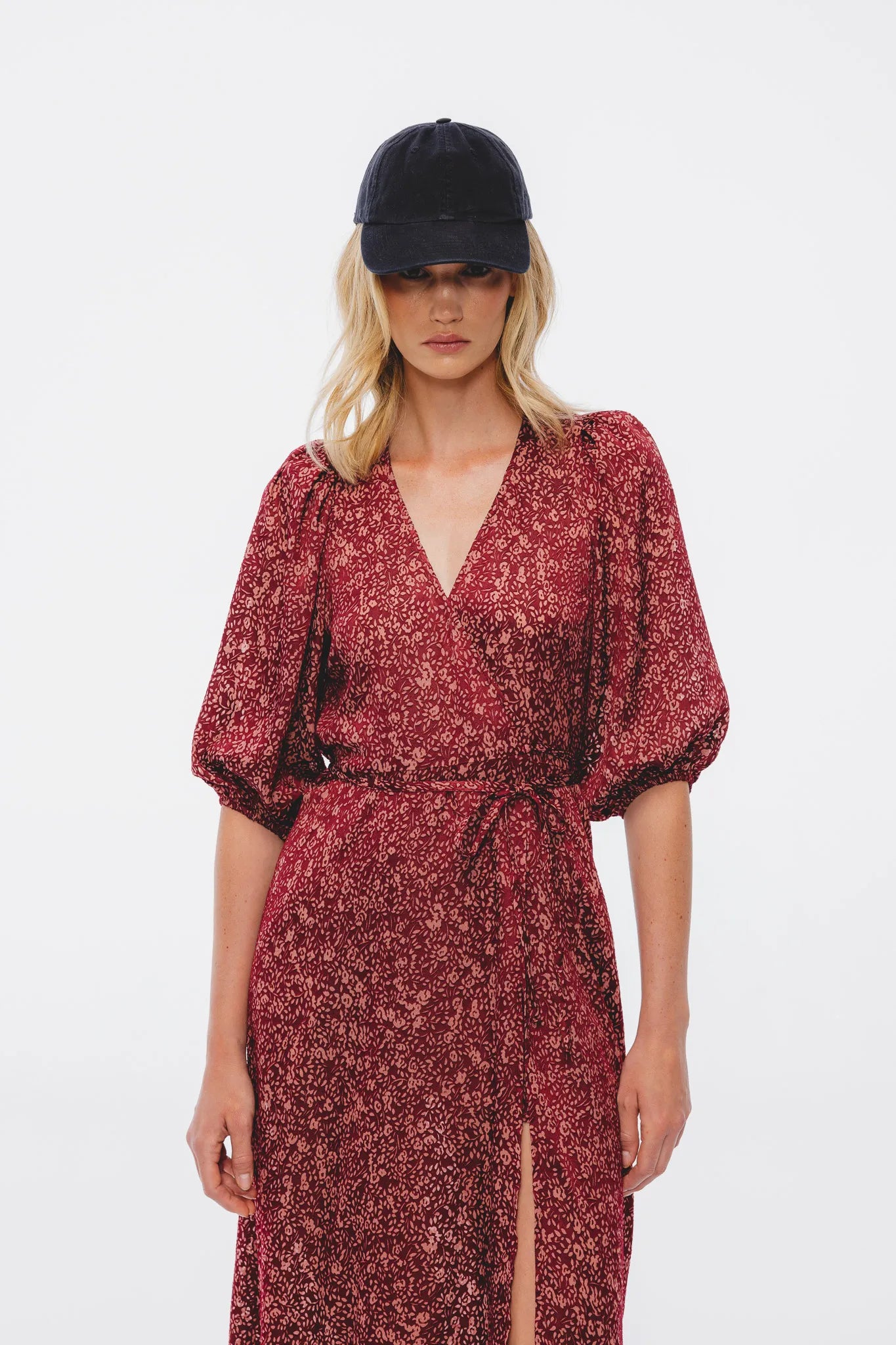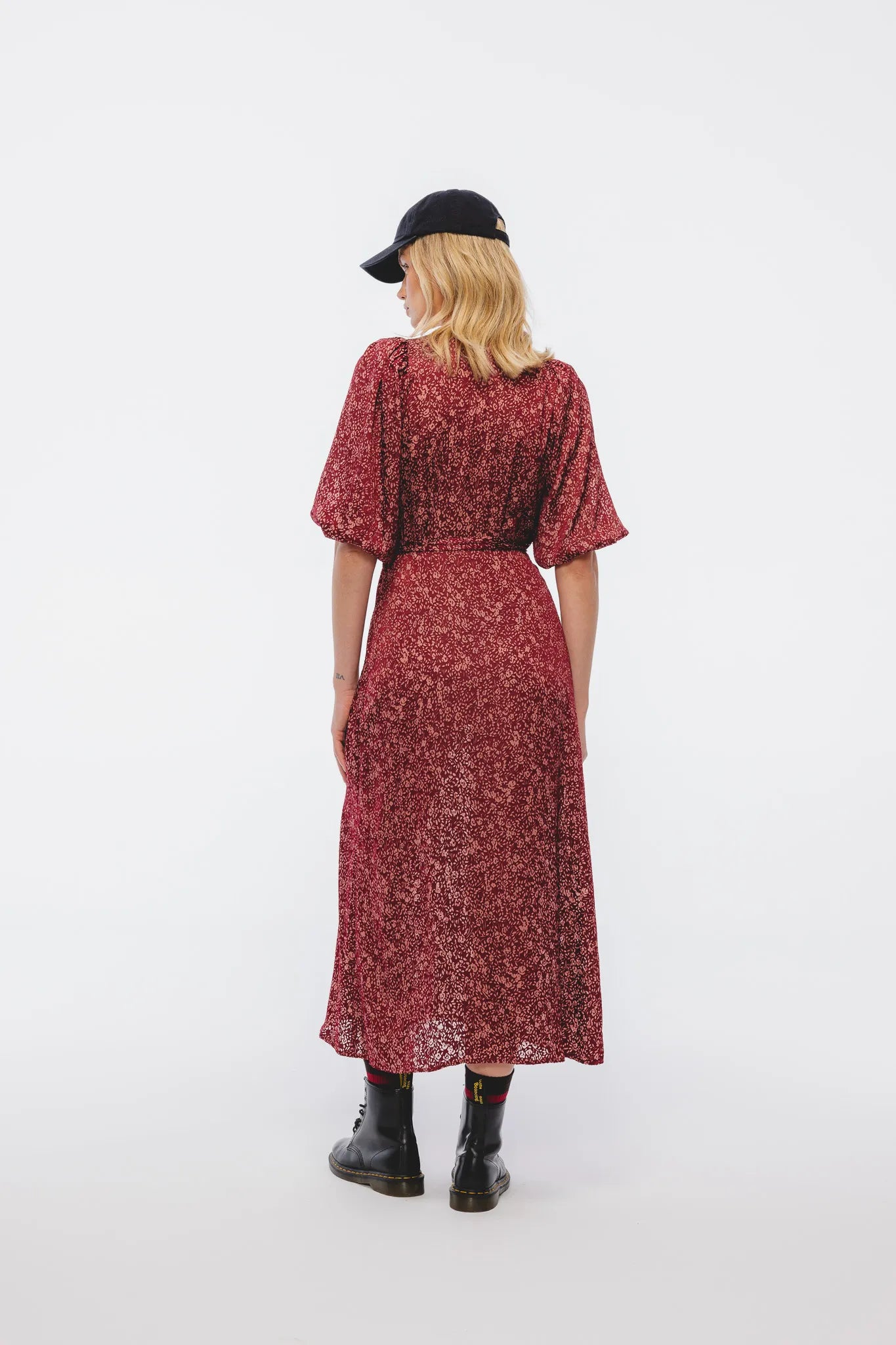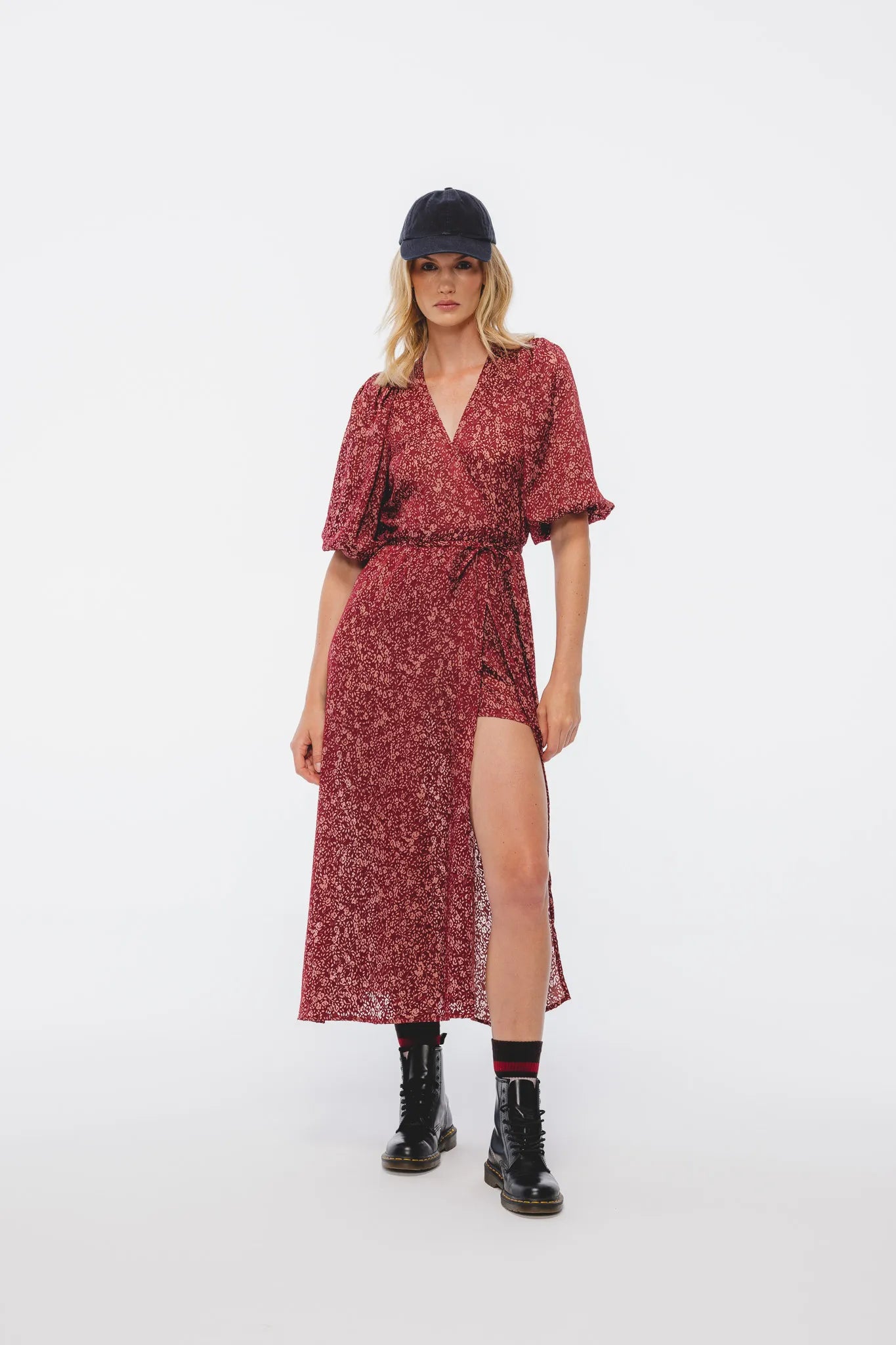 Mary to długa sukienka o kopertowym kroju, która otula sylwetkę z lekkością i wdziękiem. Uszyta z wypalanej tkaniny o subtelnym kwiatowym wzorzew odcieniach bordo i różu – gra fakturą i światłem przy każdym ruchu.