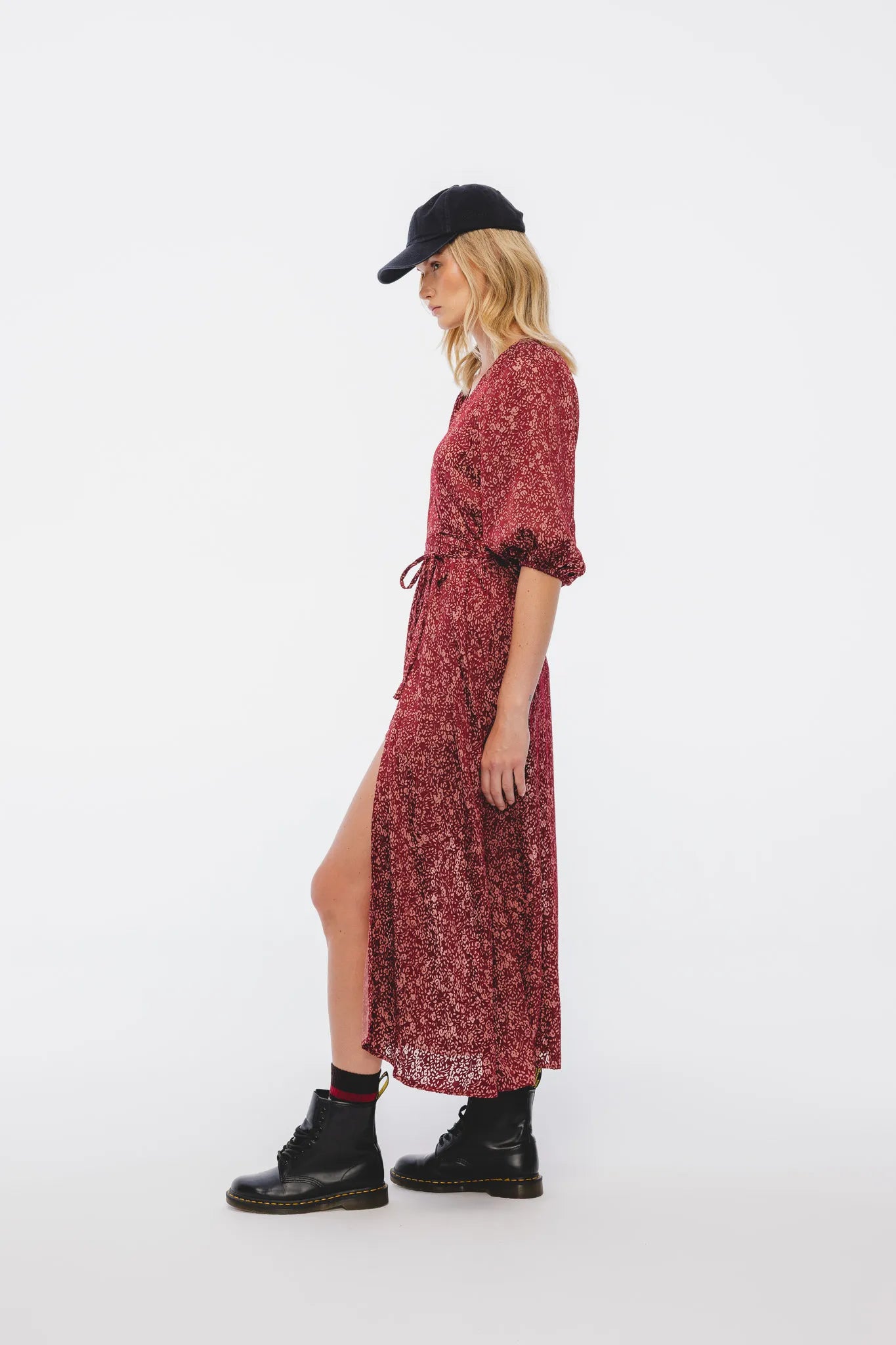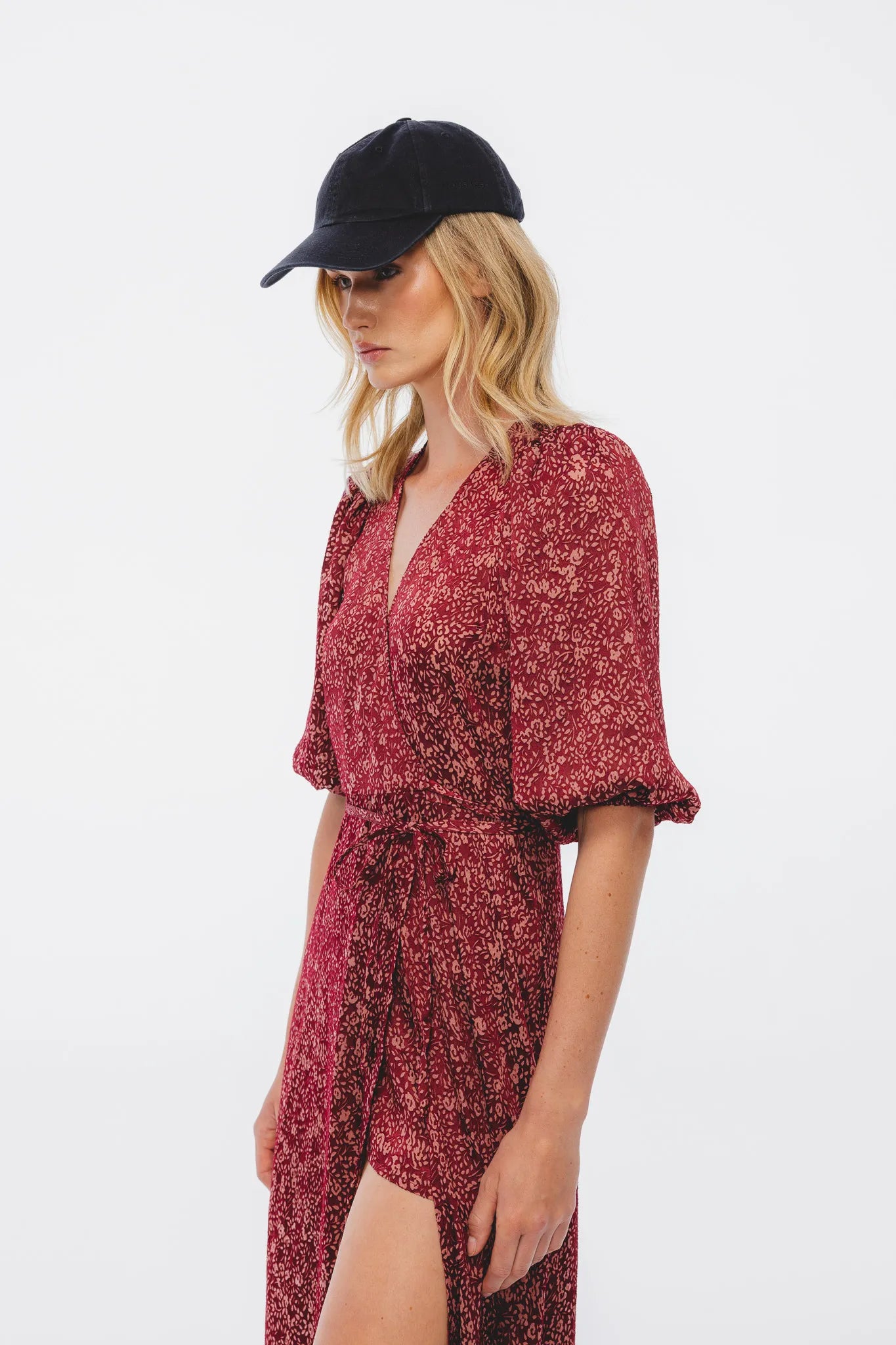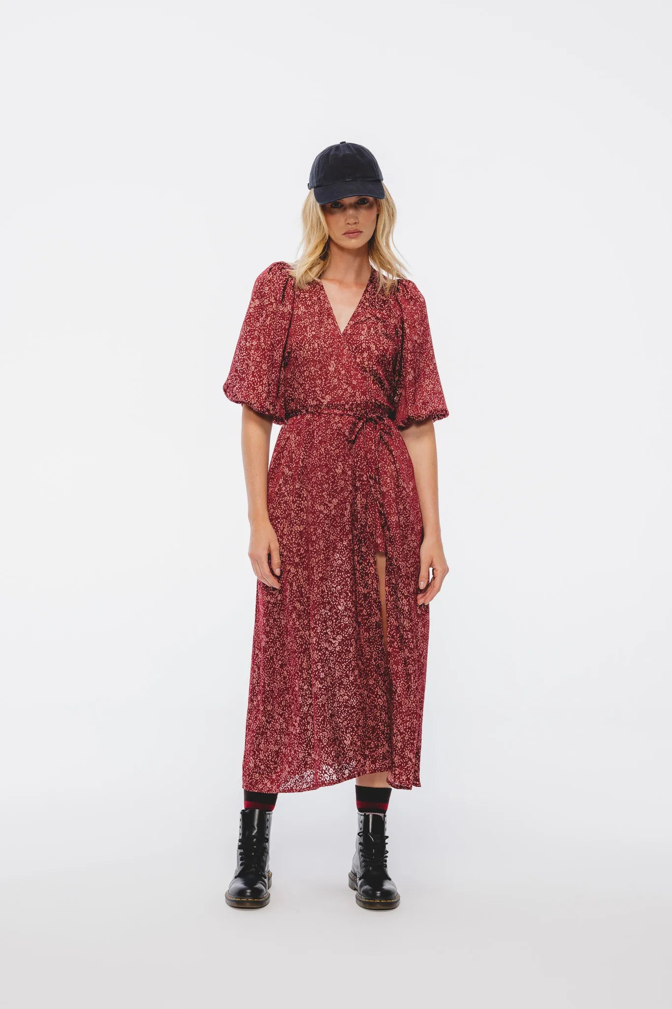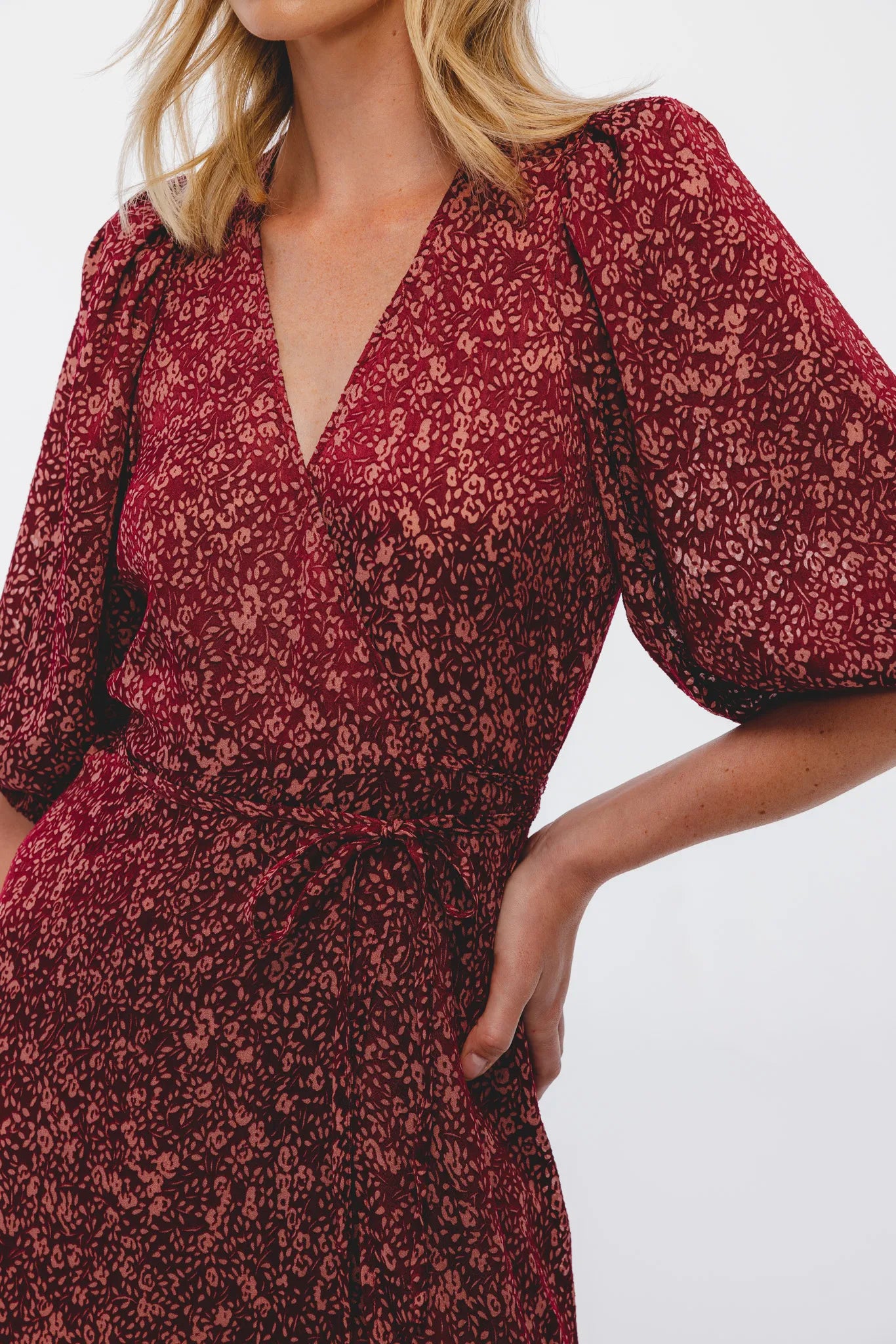 Mary to długa sukienka o kopertowym kroju, która otula sylwetkę z lekkością i wdziękiem. Uszyta z wypalanej tkaniny o subtelnym kwiatowym wzorzew odcieniach bordo i różu – gra fakturą i światłem przy każdym ruchu.