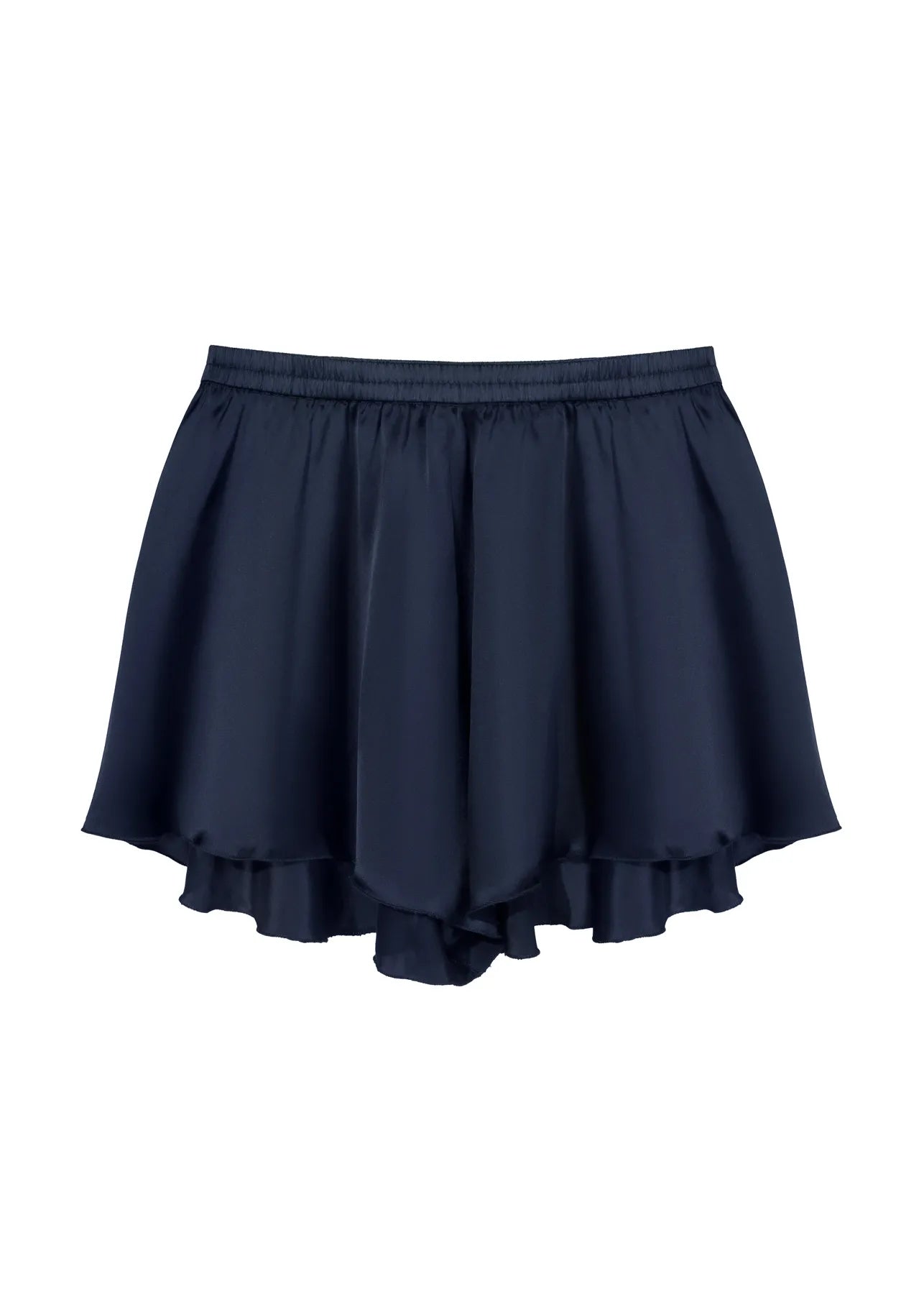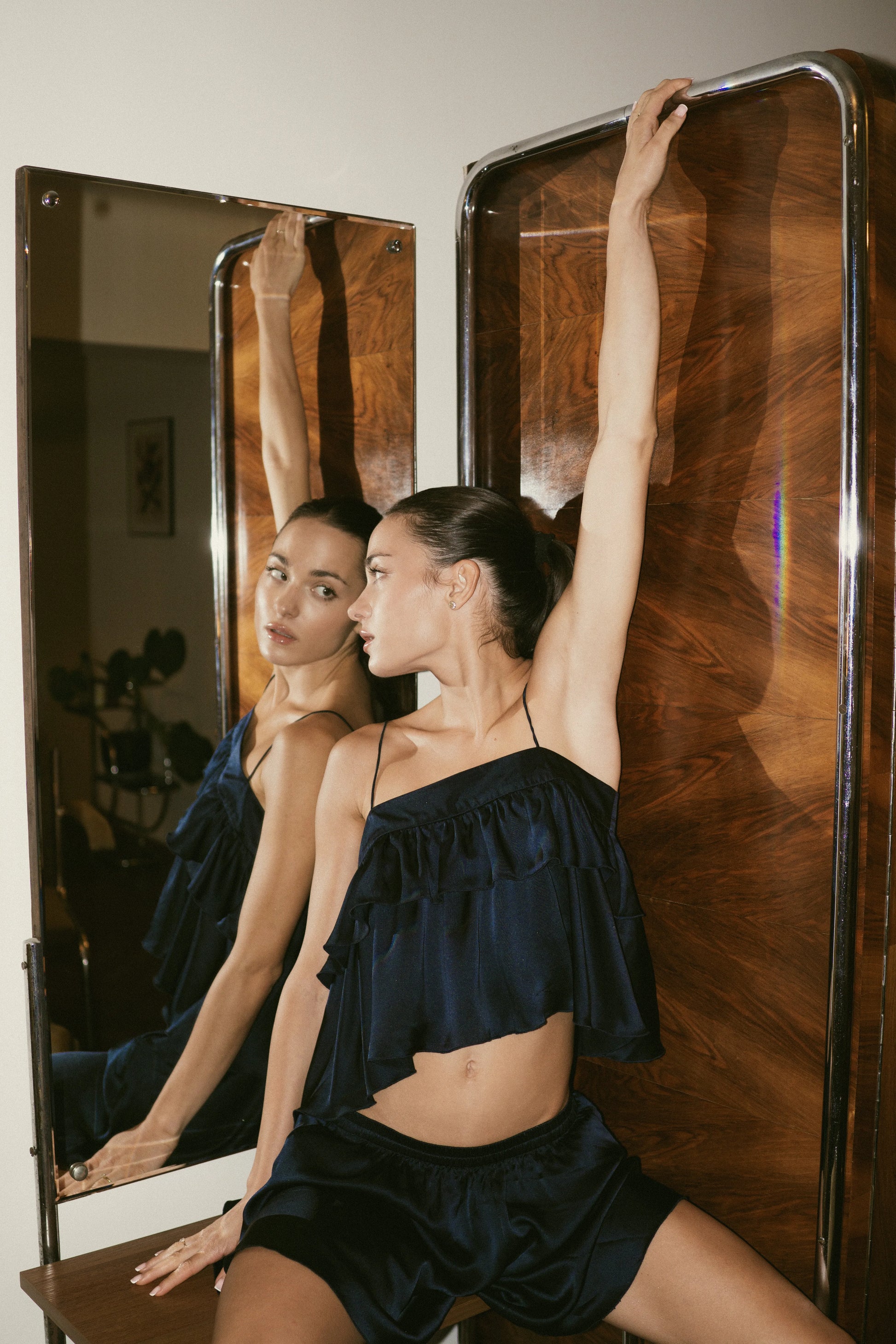 Szorty Iskra to uosobienie lekkości i swobody – stworzone, by poruszać się razem z Tobą. Uszyte z najdelikatniejszego jedwabiu o głębokim, granatowym odcieniu, miękko otulają ciało i subtelnie połyskują przy każdym ruchu.
