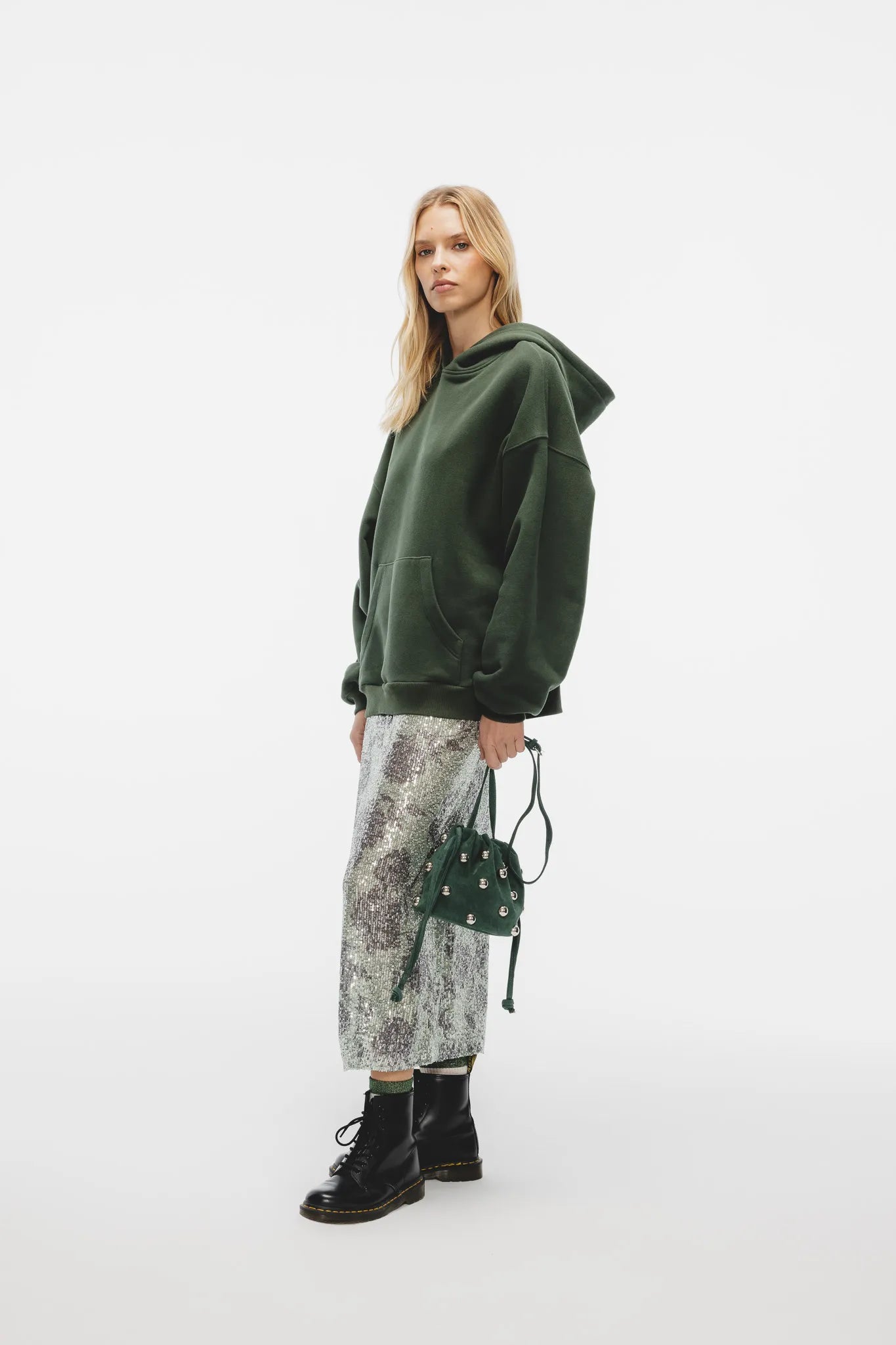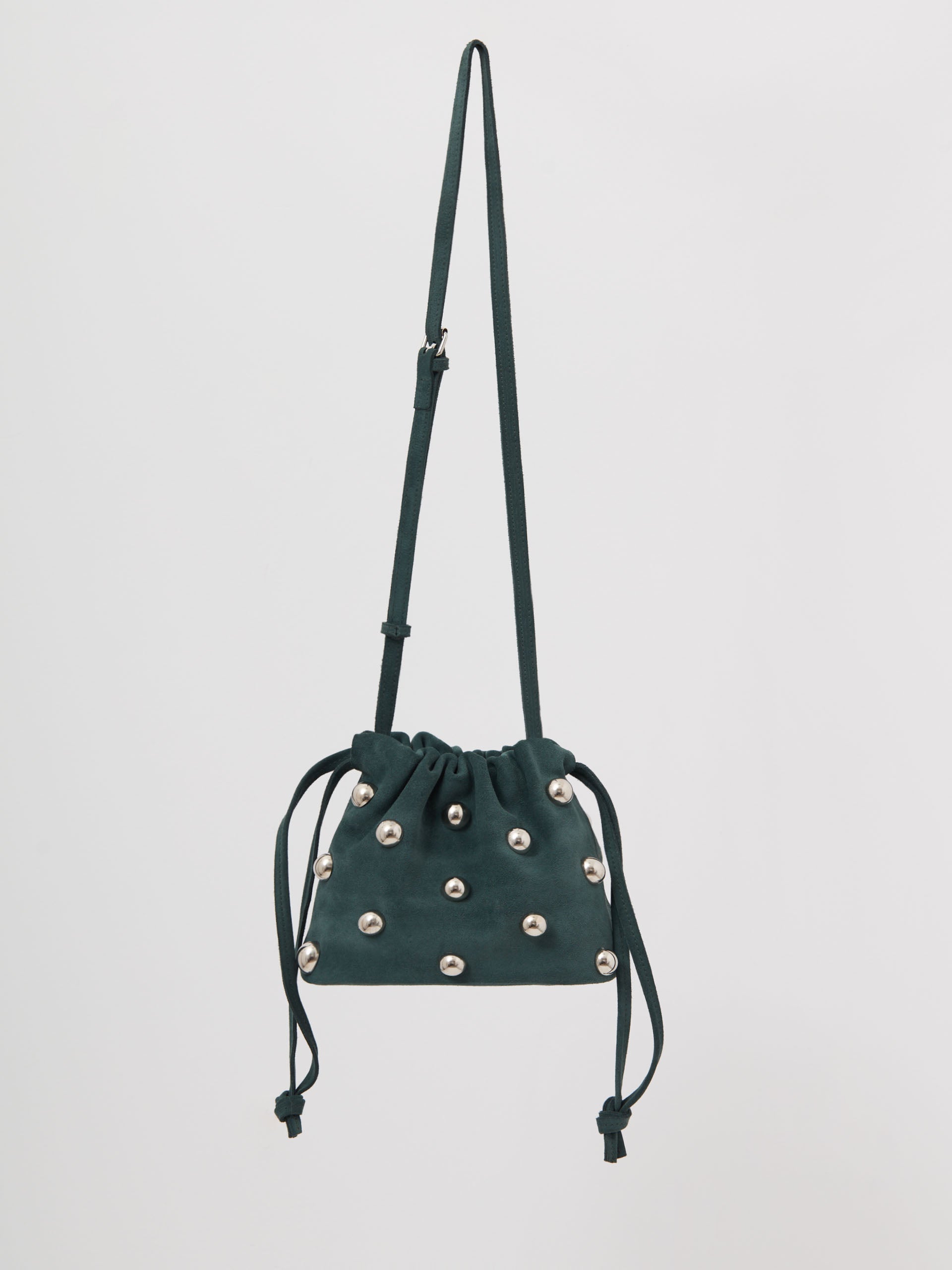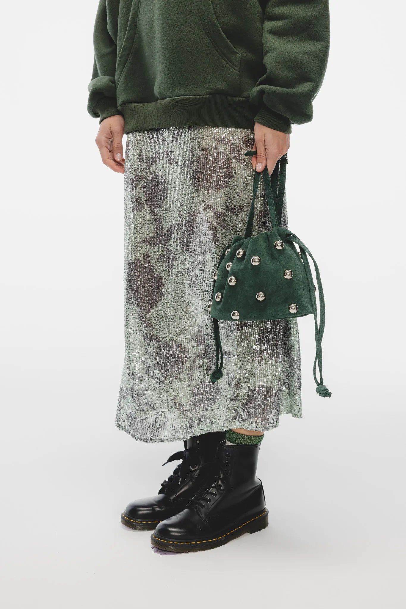 Charlotte to elegancka torebka typu worek, wykonana z miękkiej skóry zamszowej w głębokim, szmaragdowym odcieniu. Jej minimalistyczną formę przełamują srebrne, okrągłe nity rozmieszczone na całej powierzchni, dodając całości nowoczesnego charakteru i odrobiny rockowego akcentu.